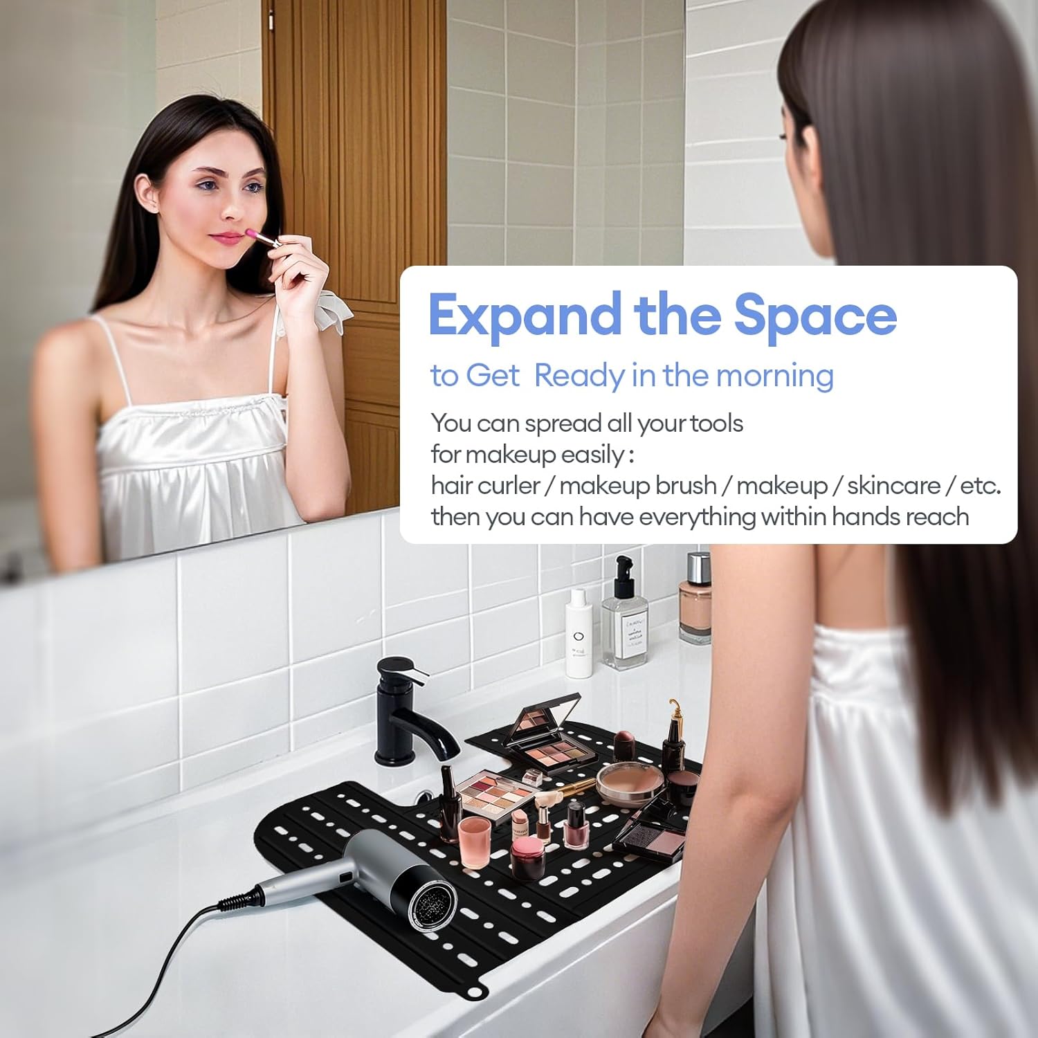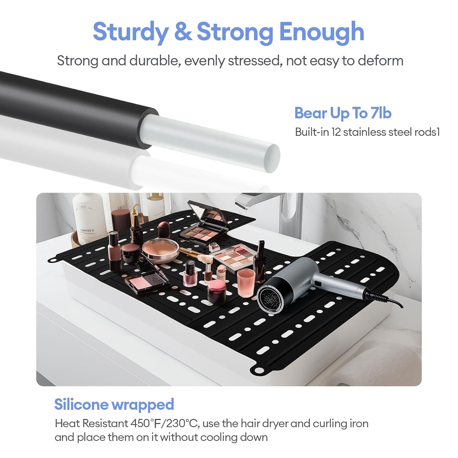 - Sturdy and durable: The sink cover for counter space is made of soft heat-resistant silicone and can withstand temperatures up to 480°F. There is no need to worry about hair dryers, curling irons, and other heating tools scalding the desktop; there is a steel rod running through the silicone, which is high temperature resistant and has a high load-bearing capacity. It is not easy to collapse and can bear up to 7 pounds.