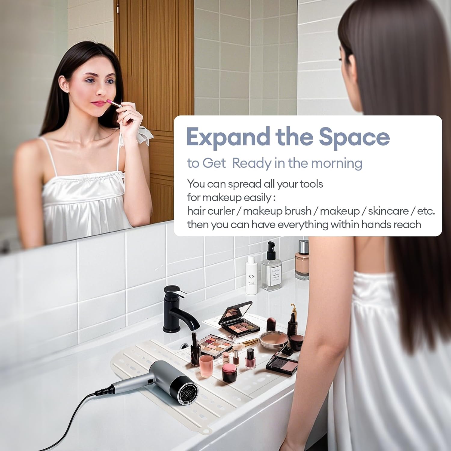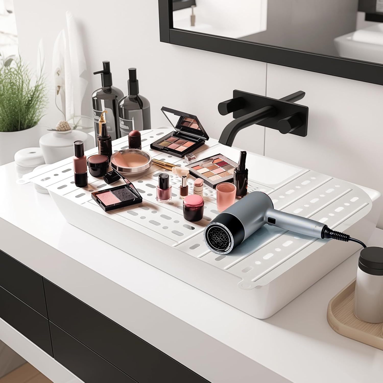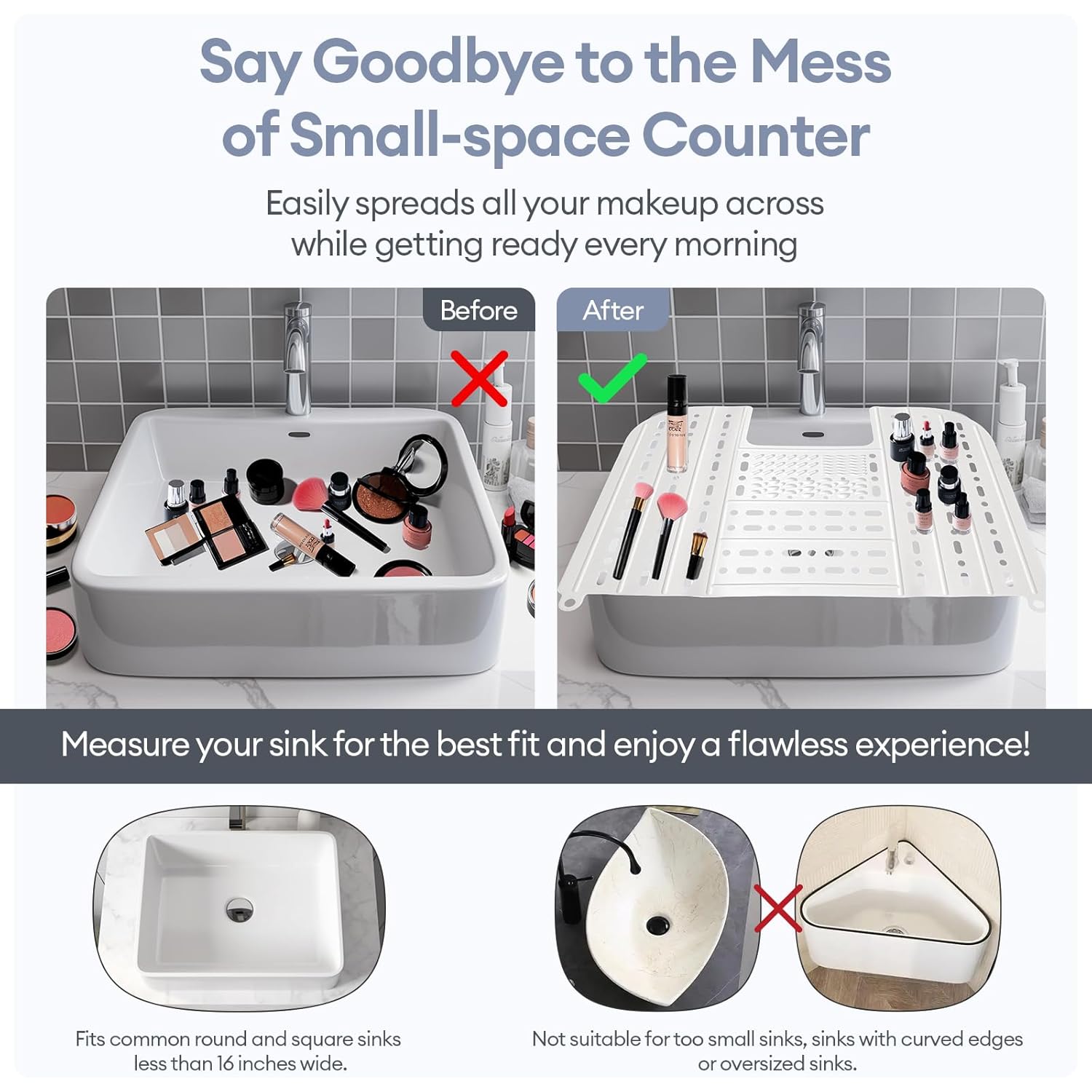 - Maximize bathroom sink space: This bathroom sink cover fits most sinks and can extend your countertop. It allows you to easily store makeup tools, such as curling irons, makeup brushes, makeup, skincare products, etc. and prevents brushes and other cosmetics from falling into the sink.