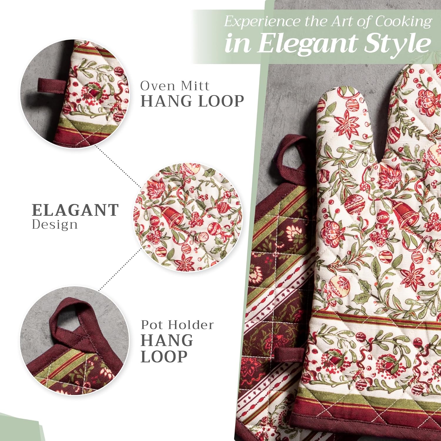 Maison d' Hermine 100% Cotton Oven Mitt & Pot Holder Set (7.5"x13" & 8"x8") Heat Resistant BBQ Cooking Gloves with Loop, Baking, Grilling, Kitchen, Handling Hot Pans (Reveillon Au Jardin)