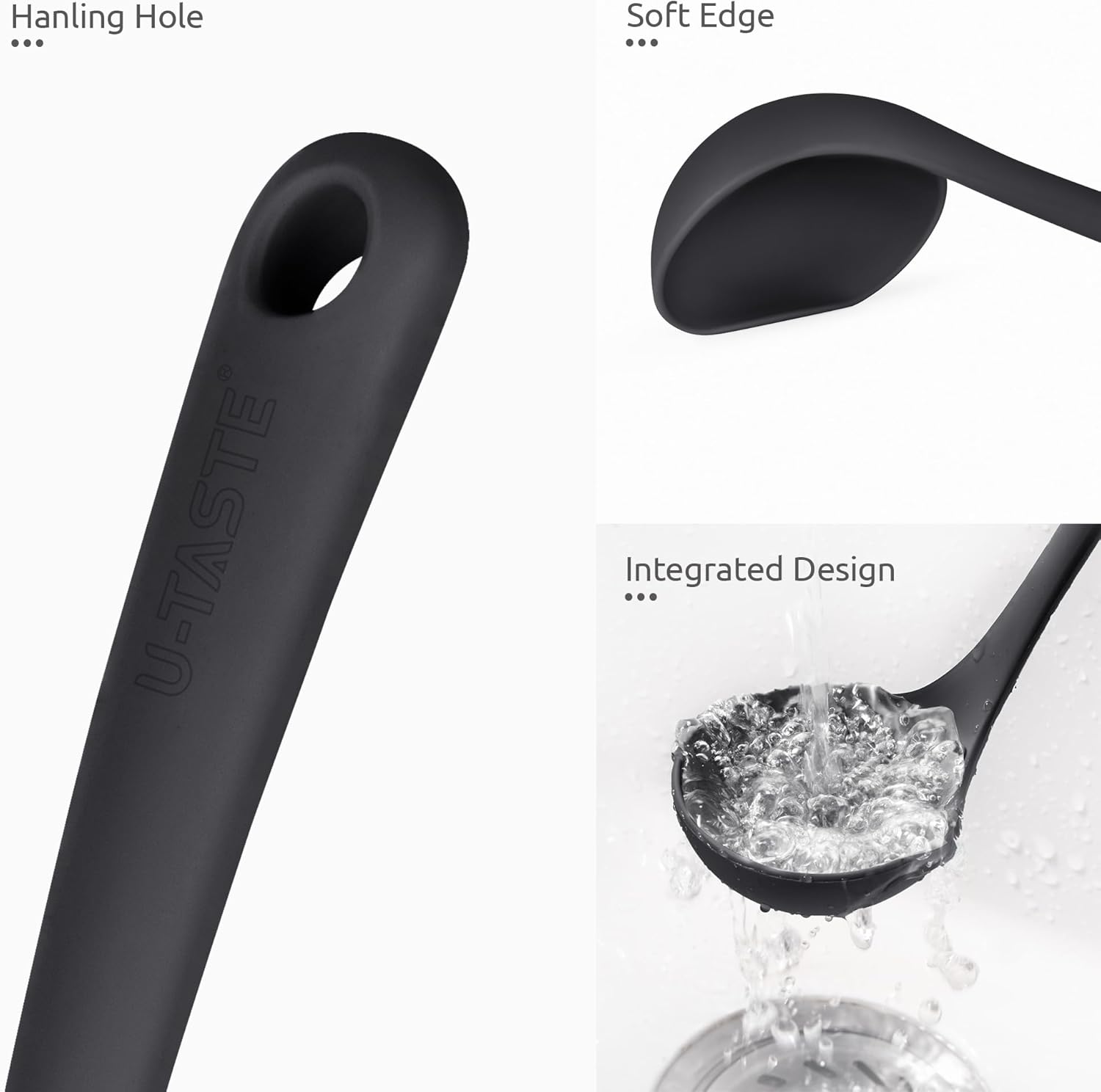 - [600ºF High Heat Resistant] It's made of food grade silicone and handles high heat well. If you forget and leave this kitchen ladle inside a pot of soup while you're eating dinner, it won't melt. You can use this cooking ladle for soups, thick chili, stews, gravy and other foodstuffs and it won't scratch your nonstick pots and pans. Integrated design makes it no small places for food to hide in! Goes through the dishwasher well or it's an easy, quick cleanup in the sink.