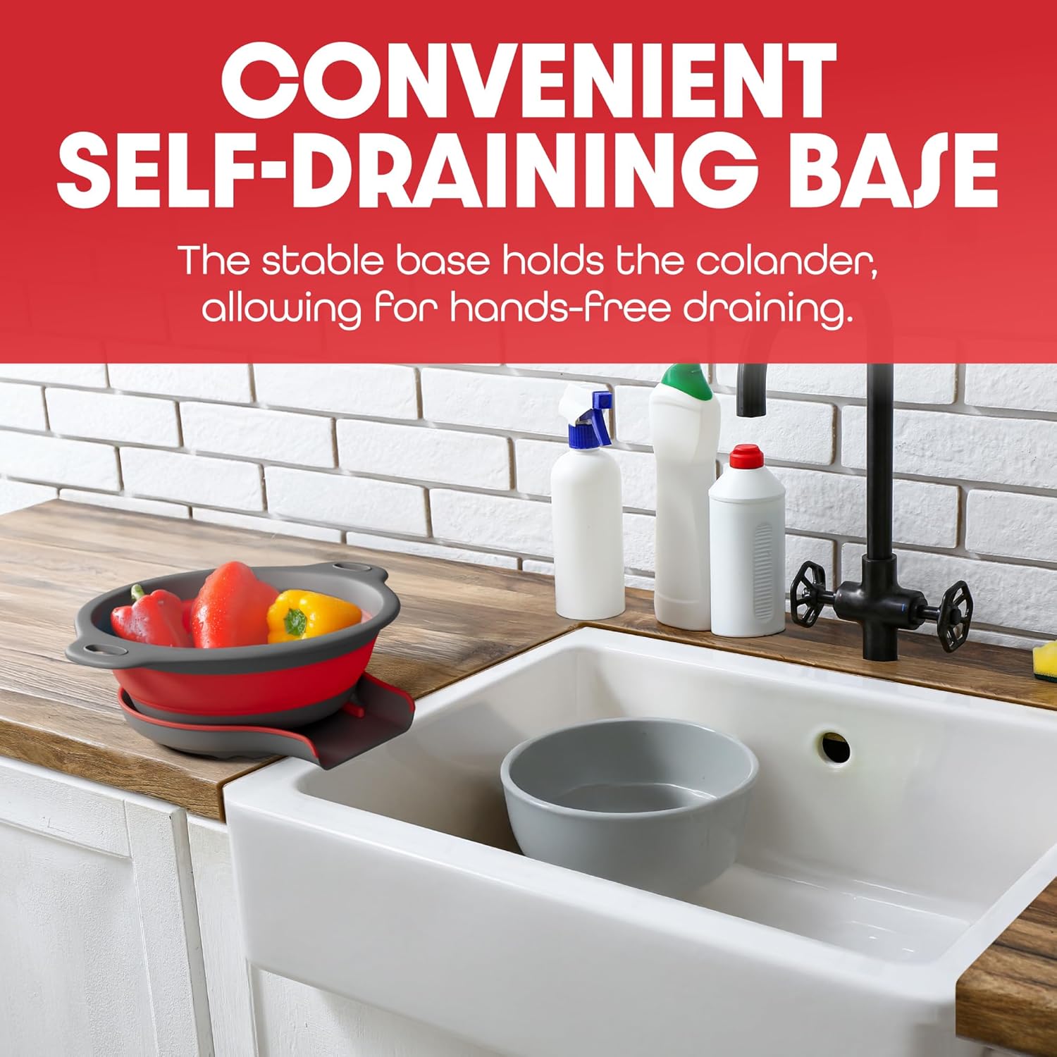 - This collapsible colander features an innovative self-draining base that allows water to drain directly into your sink, even when it's full.