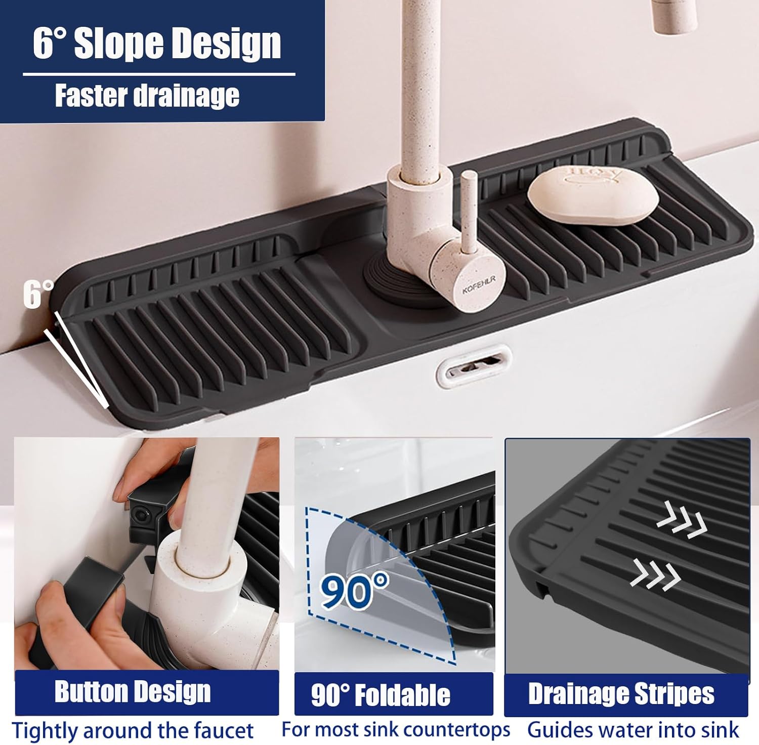 - 6° Slope Design & Button Fixation:Featuring a 6° slope and drain stripe design,the kitchen sink mat efficiently guides water back into the sink,preventing water buildup that causes mold to form around the faucet.The unique button design keeps the mat securely in place,ensuring the sink splashback behind the faucet is well sealed,preventing leaks in gaps and keeping the sink area dry and clean