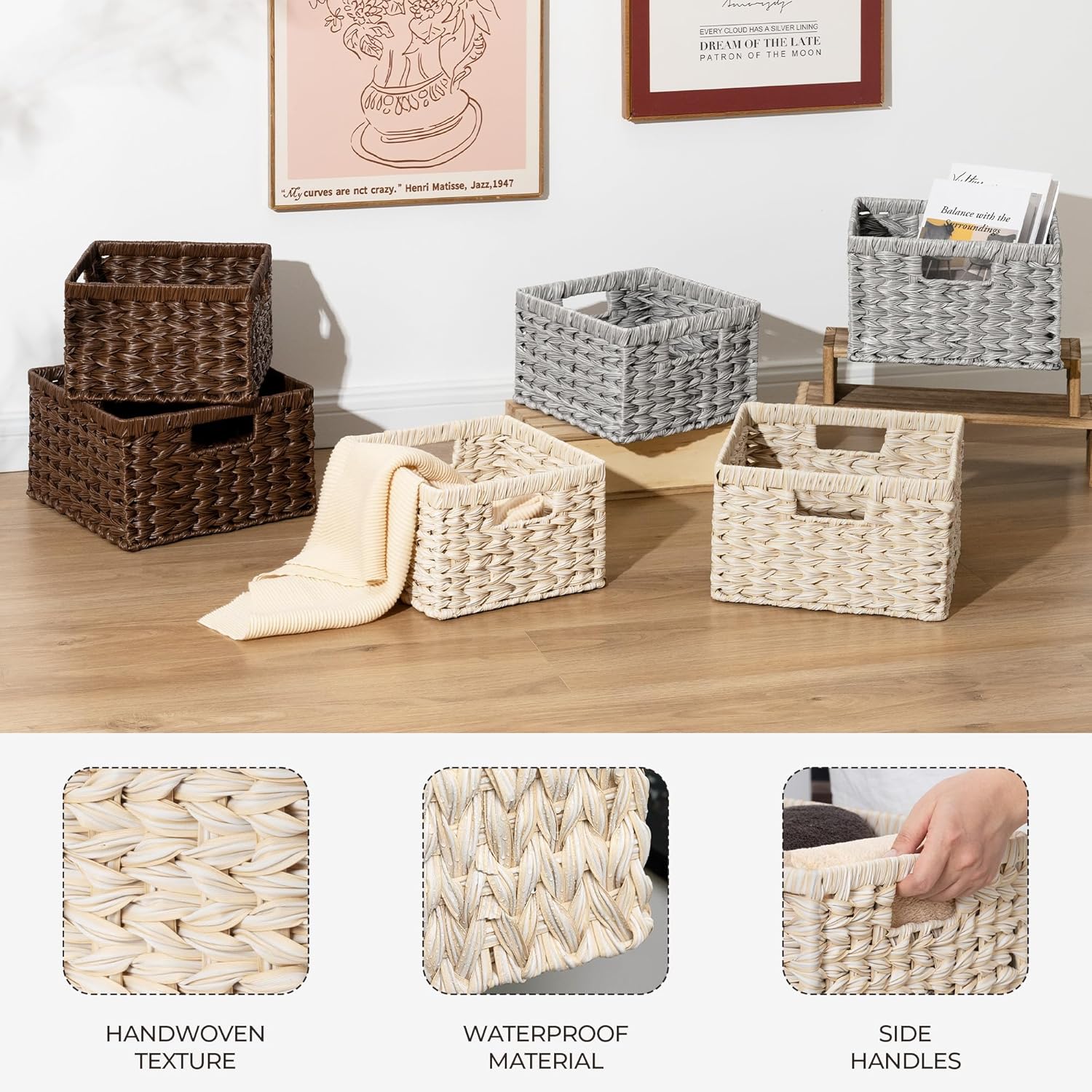 - Multiuse in Multi-room: Moisture-proof material makes the wicker bins easy to keep clean, perfect for storage use in kitchen, bathroom, and entryway to store foods, personal care products, crafts, keys, etc.
