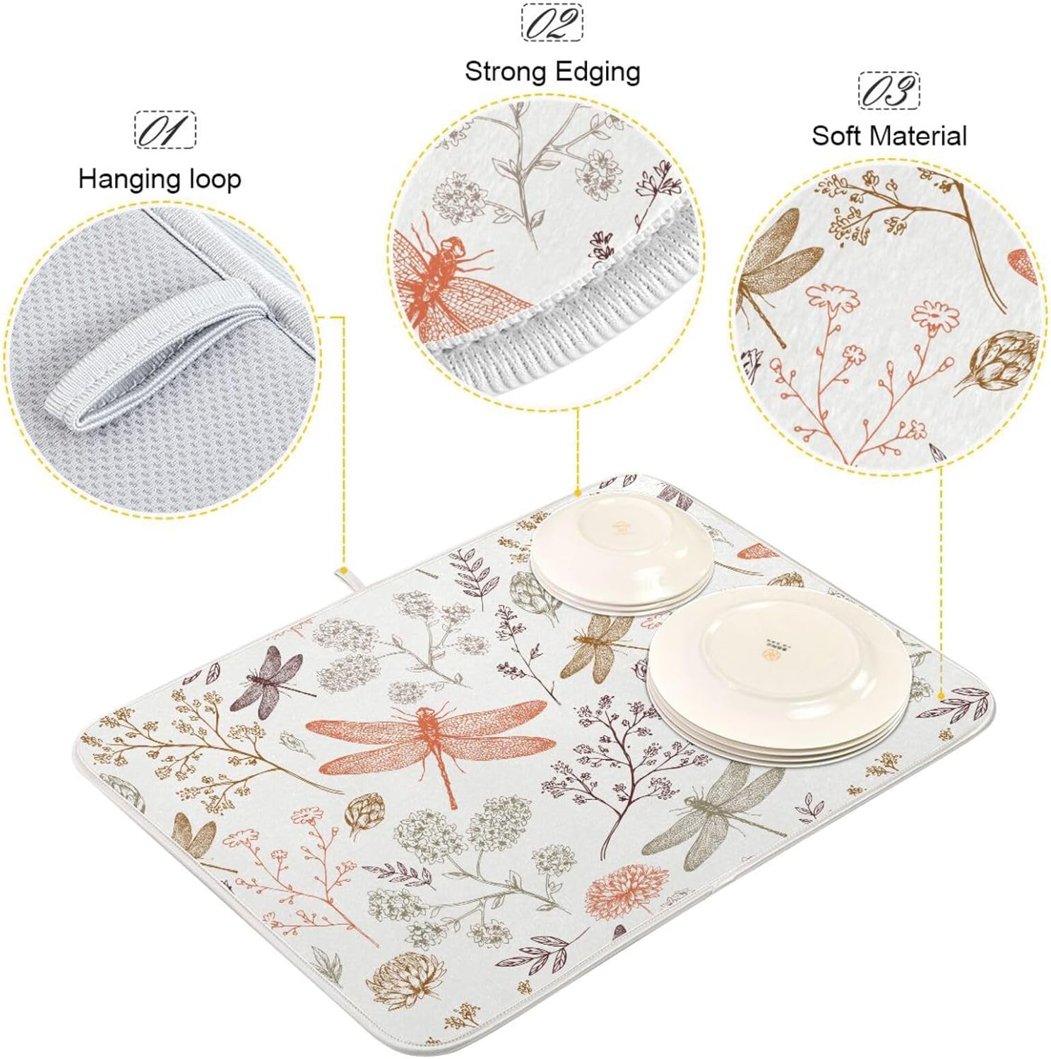 Dragonfly Botanical Plant Dish Drying Mat for Kitchen Counter Absorbent Microfiber Drying Pad, Medium 16x18 in, Reversible Drainer Mats