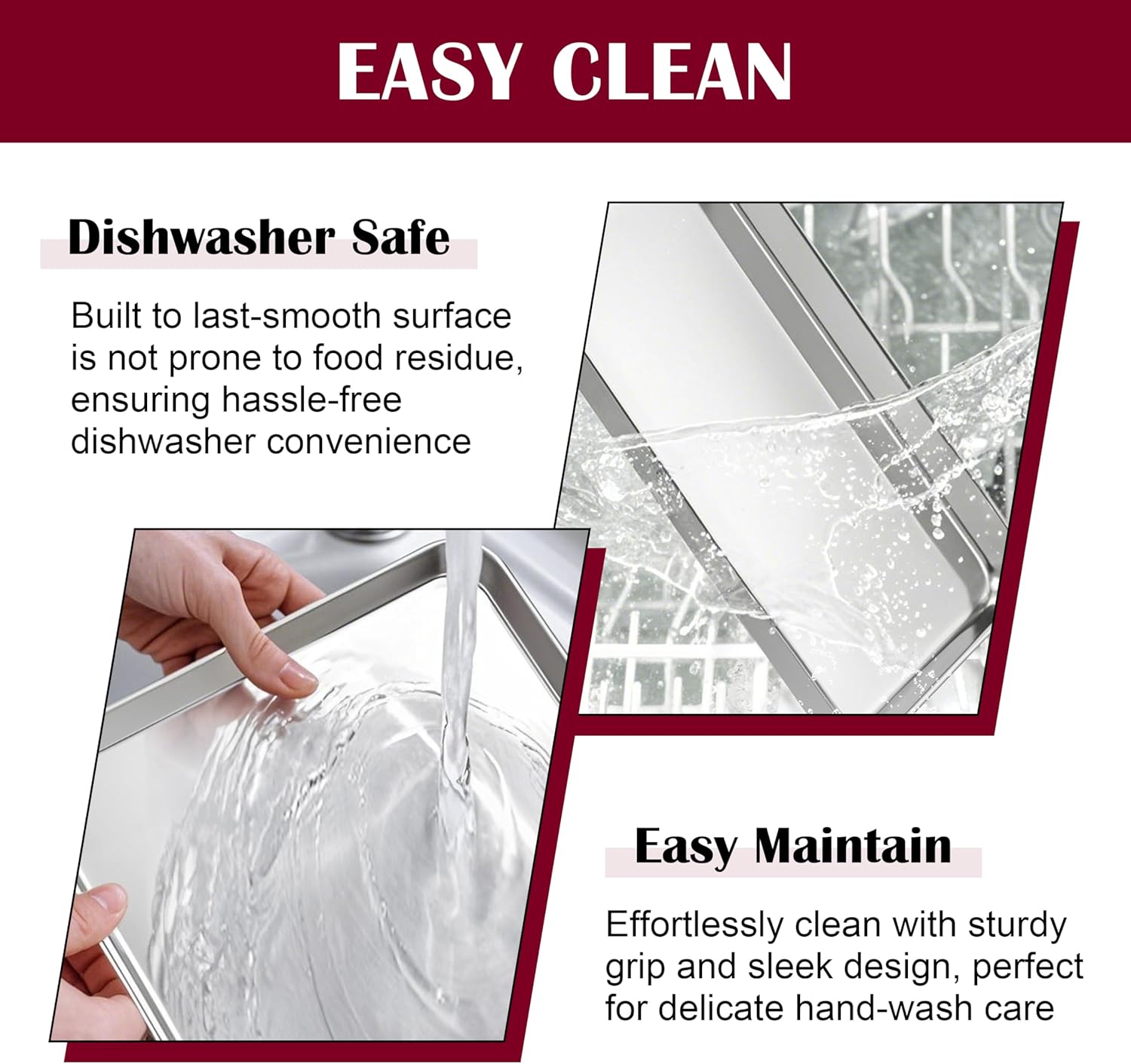 - EFFORTLESS CLEANING: Polished surface is smooth and burr-free for a comfortable grip, Resists stains and grease from sticking, 1 Inch deep rims prevent spills, Stackable design ensures compact and organized storage, Dishwasher safe and easy to clean by hand, Ideal for busy households