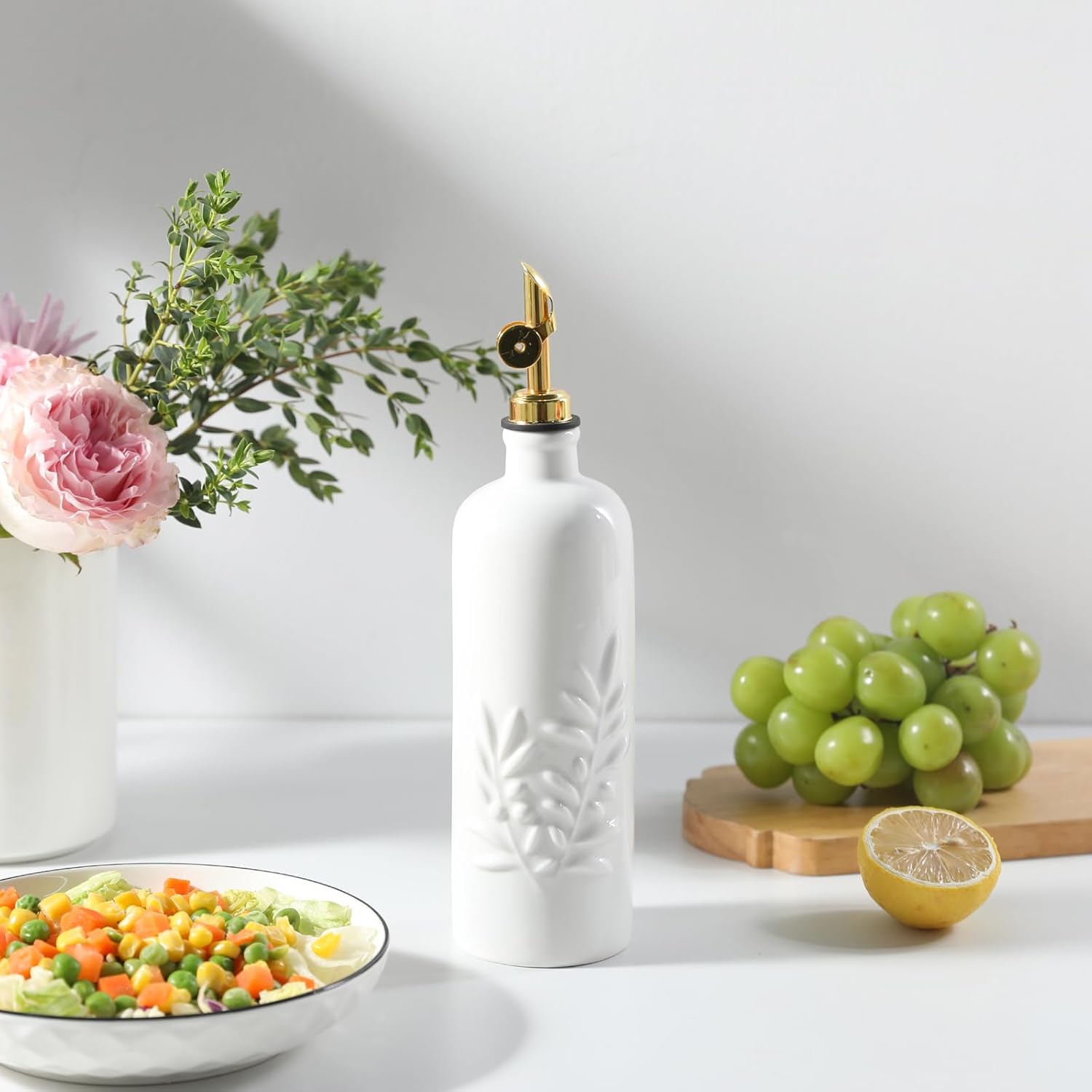 - Elegant Olive Leaf Relief Design-Featuring a beautifully crafted olive leaf, this ceramic oil dispenser adds a touch of charm to your modern kitchen. Its opaque finish and sleek spout complement any décor.