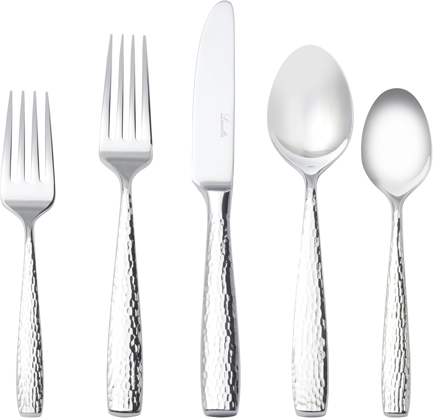 Luciella Ponza Flatware Set for 12, 65-Piece Stainless Steel Silverware Set with Serving Utensils, Timeless Hammered Design, Rust-Resistant, Mirror Polished & Dishwasher Safe