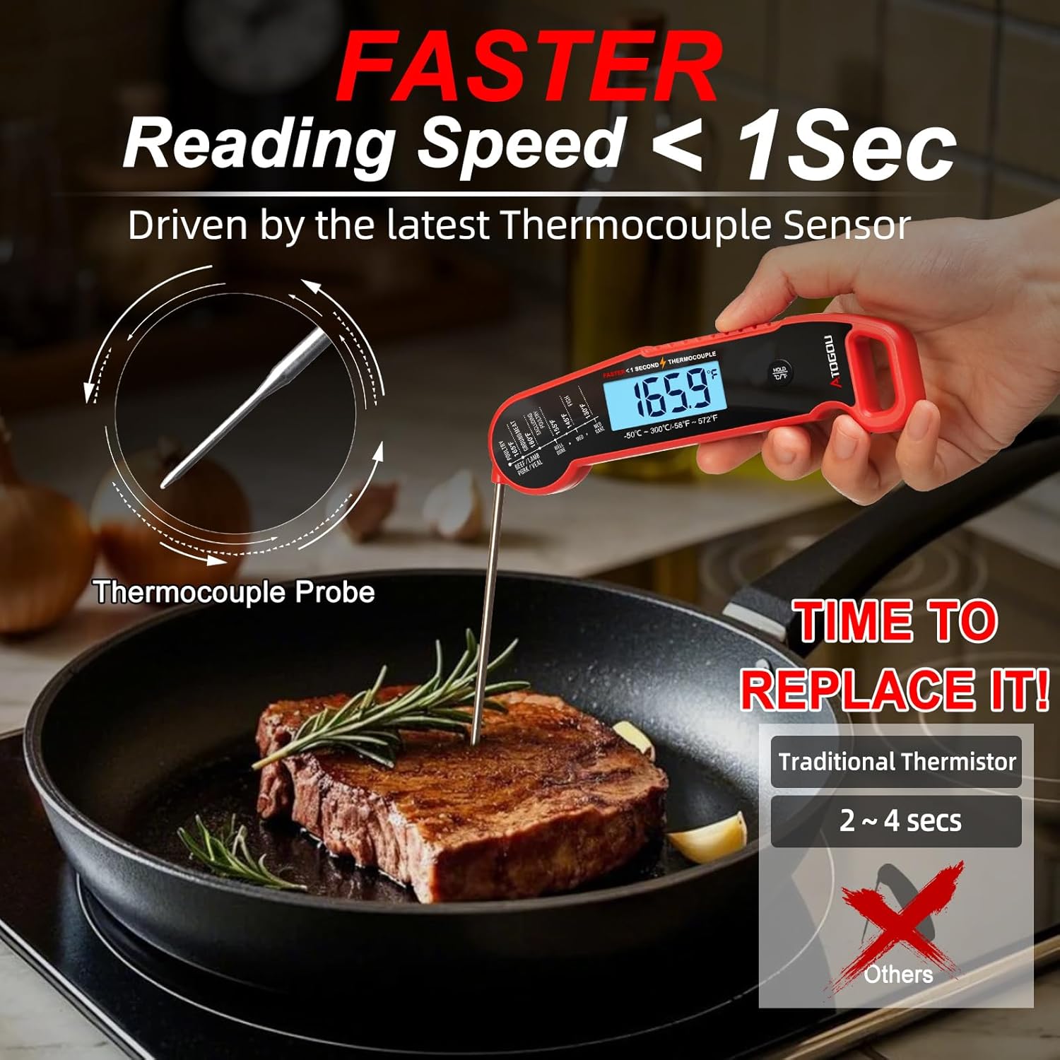 - [ Advanced Thermocouple Sensor ]: Equipped with advanced thermocouple sensors, this digital thermometer responds in under 1 second, which is 3X faster than traditional thermal resistance thermometers. This instant feedback ensures precise temperature control, preventing overcooking and delivering perfectly cooked meat