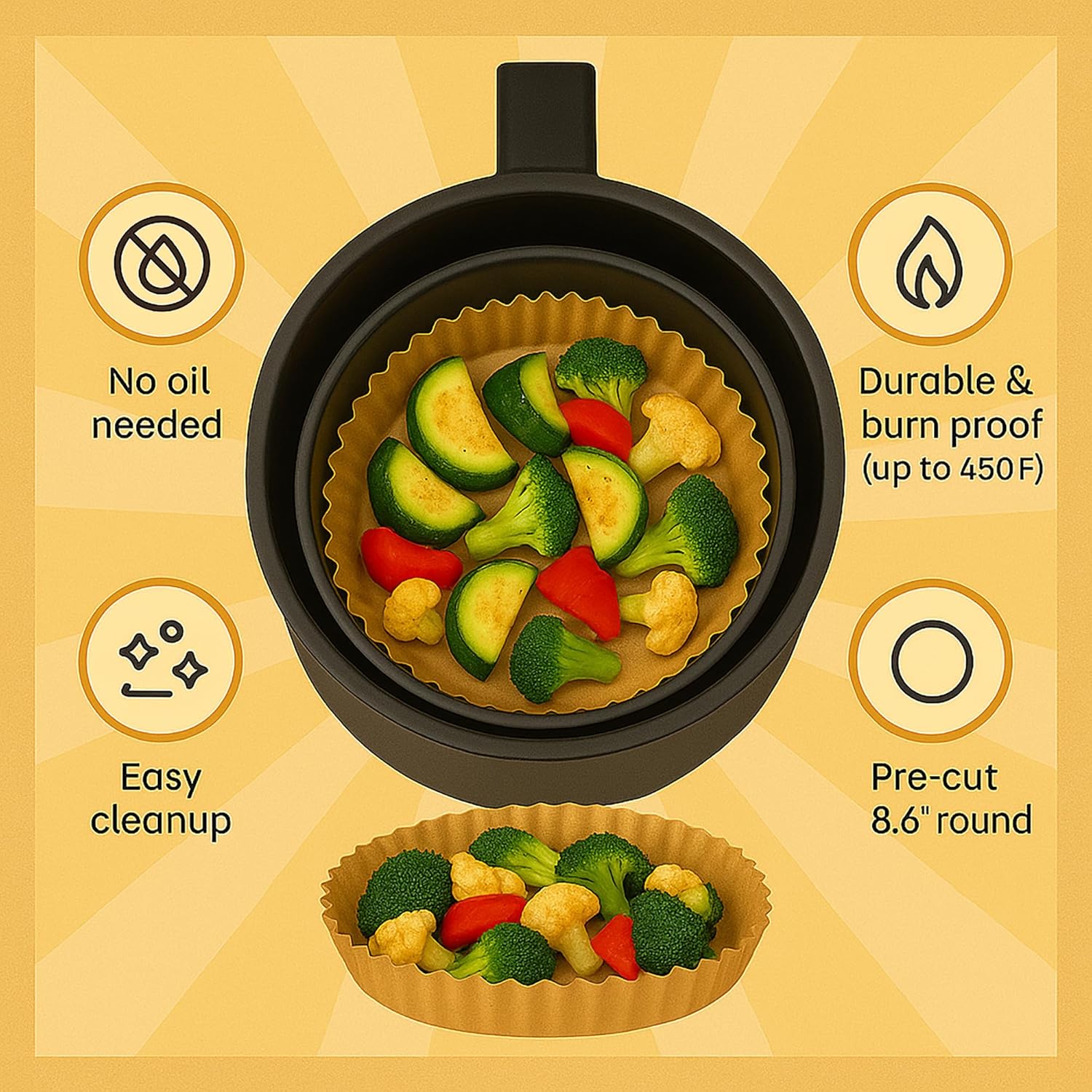 - Customized Convenience: Each pack includes 125 pre-cut 8 inch round liners, eliminating the hassle of trimming or folding to fit your air fryer. Enjoy the convenience of perfectly sized liners every time.