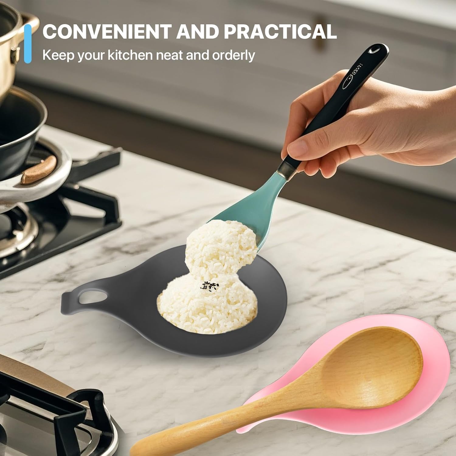 - Rational Design: The silicone spoon rest is large enough to hold multiple spatula, eggbeater, spoon, or sponge, soap, etc. The end of the spoon rest for stove top is curved to support the handle part of the kitchen utensils, which is easy to place.