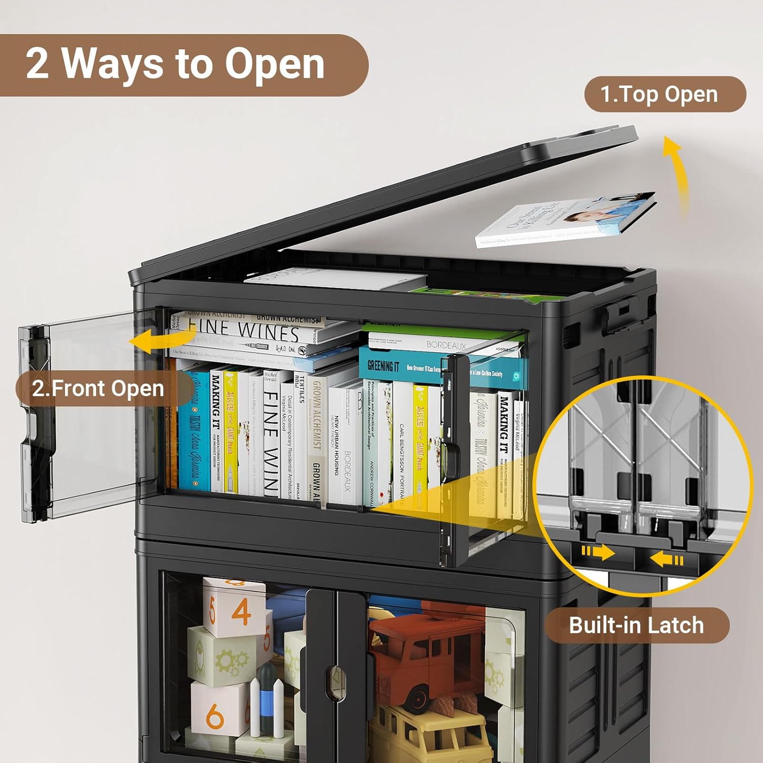 - [Foldable and Easy to Install] The Collapsible Storage Box with Doors is a new storage organizer with a foldable design that can be folded away on all sides when not in use, transforming the storage cube into a flat panel for easy storage under the bed or trunk. When need to use it, you don't need tools, just continue with a few manual steps to complete the installation.