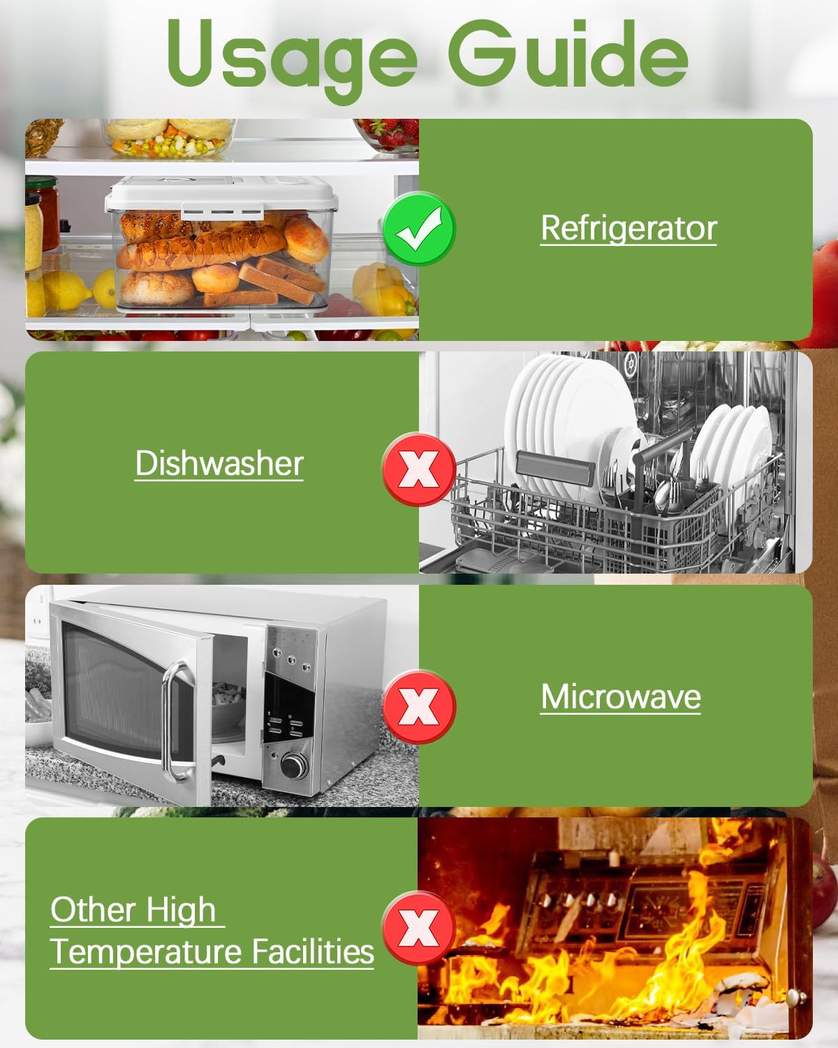 - Usage Guide: When closing the buckle, please apply downward pressure first and then push inward to better ensure the sealing of the box. Note: The bread box is not resistant to high temperatures, so it cannot be washed in a dishwasher or placed in a microwave, but can be used for refrigerator storage