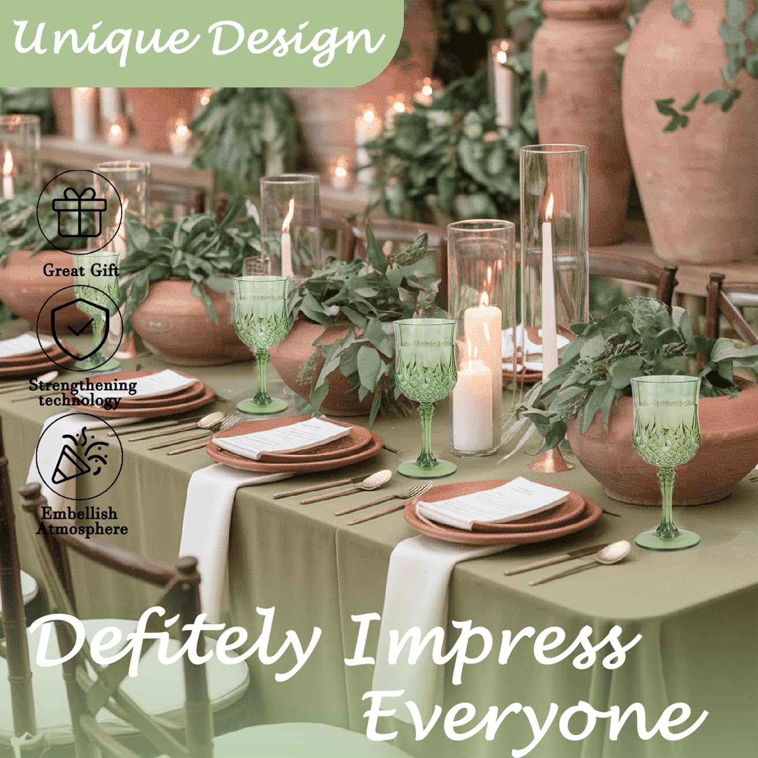 - 🍷🍷🍷【Product Description】 This set includes 48 retro-style light green party plastic wine glasses, providing ample quantity to meet your daily use and replacement needs. The elegant and sophisticated design makes your wedding reception unique.