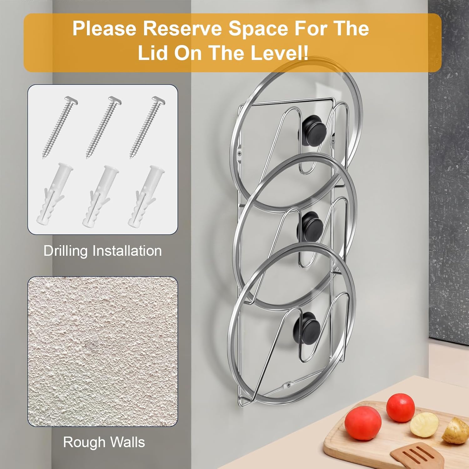 - LOSSLESS INSTALLATION: The 5.9-inch adhesive for smooth cabinets, or screw for textured walls/tiles. Install a wall mounted pot lid holders, and reheat leftovers faster than in the microwave! Great for use as a pots lid organizers inside cabinet