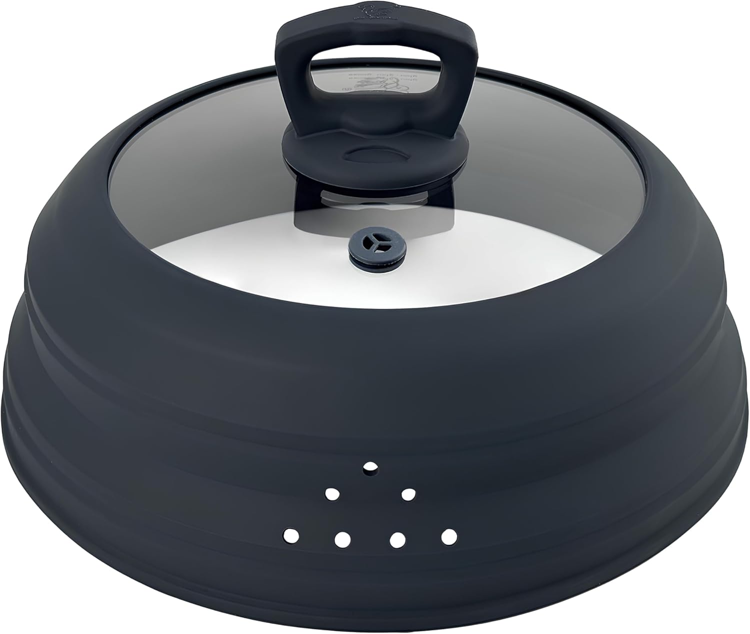 Microwave Splatter Cover Collapsible Silicone & Tempered Glass 10.8 Inch Microwave Cover for Food Splatter Guard with Steam Vents Dishwasher Safe Fits Bowls, Plates & Pots (Gray)