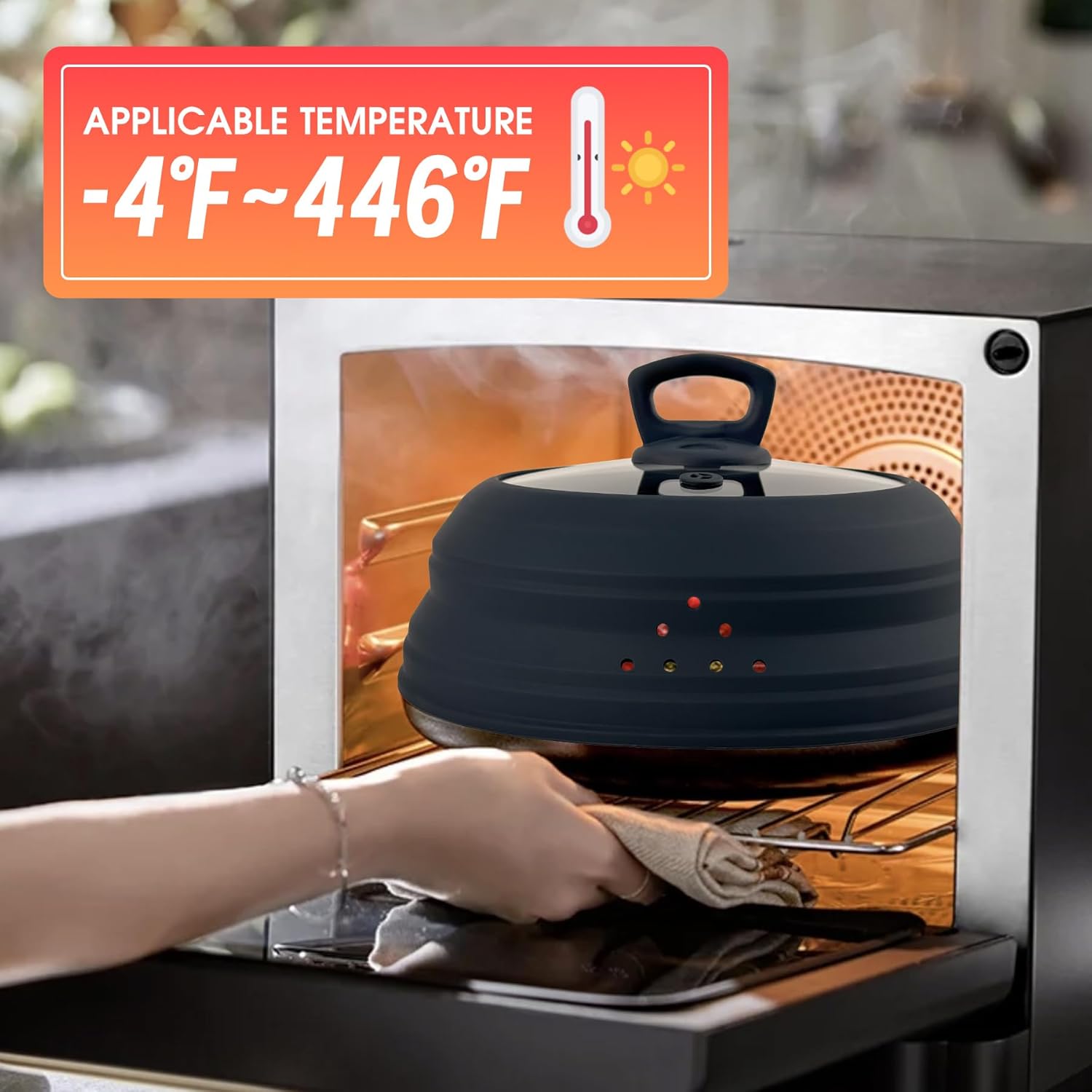 - [Scientific Steam Control]: 16 precision-engineered steam vents release excess moisture while retaining ideal humidity, ensuring evenly heated meals without sogginess or dryness. Tempered glass top withstands extreme temperatures from -40°F to 446°F, and non-slip silicone edges grip securely on microwave turntables. Perfect for reheating soups, sauces, and leftovers without messy spills.