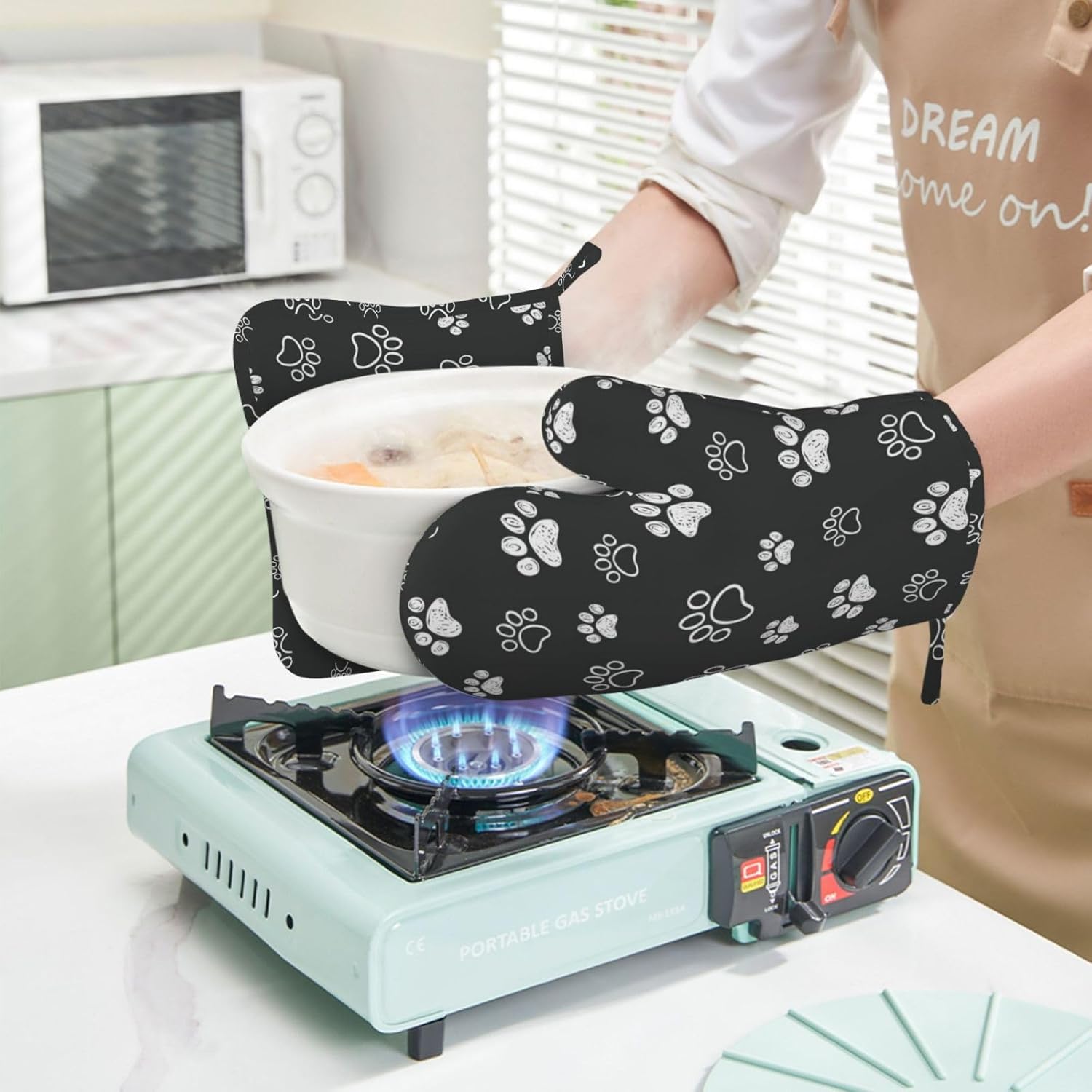 - HEAT RESISTANT: The dog paw print silicone oven mitts and non-slip pot holders set are heat resistant at 392 F/200 C because of their durable construction so they can effectively keep you protected from burning while you enjoy cooking and grilling
