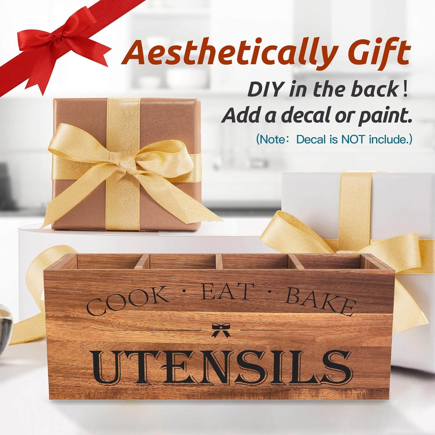 - UPGRADE DIVIDER DESIGN - Our acacia wooden utensil organizer has 4 compartments. Large, roomy and pretty. Easy to grab utensils. Size:15.74"L x 5.9"W x 7.08"H. You can store all of your cooking tools easily and neatly. The rectangular shape can fit in nicely against the wall. A nice kitchen decoration!