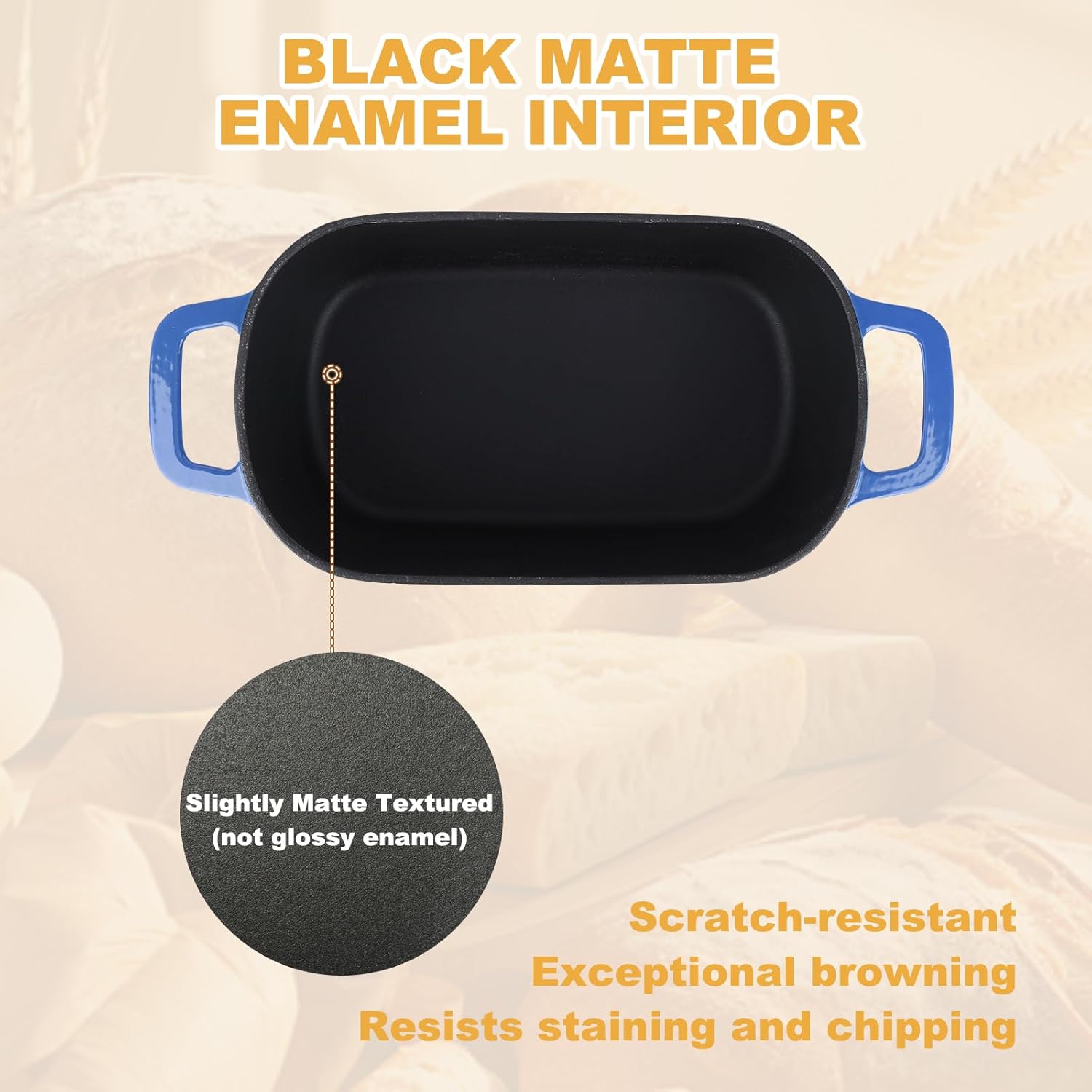- Black Matte Enamel Interior: Scratch-resistant and resistant to staining or chipping. Its textured surface promotes excellent browning—perfect for baking homemade bread