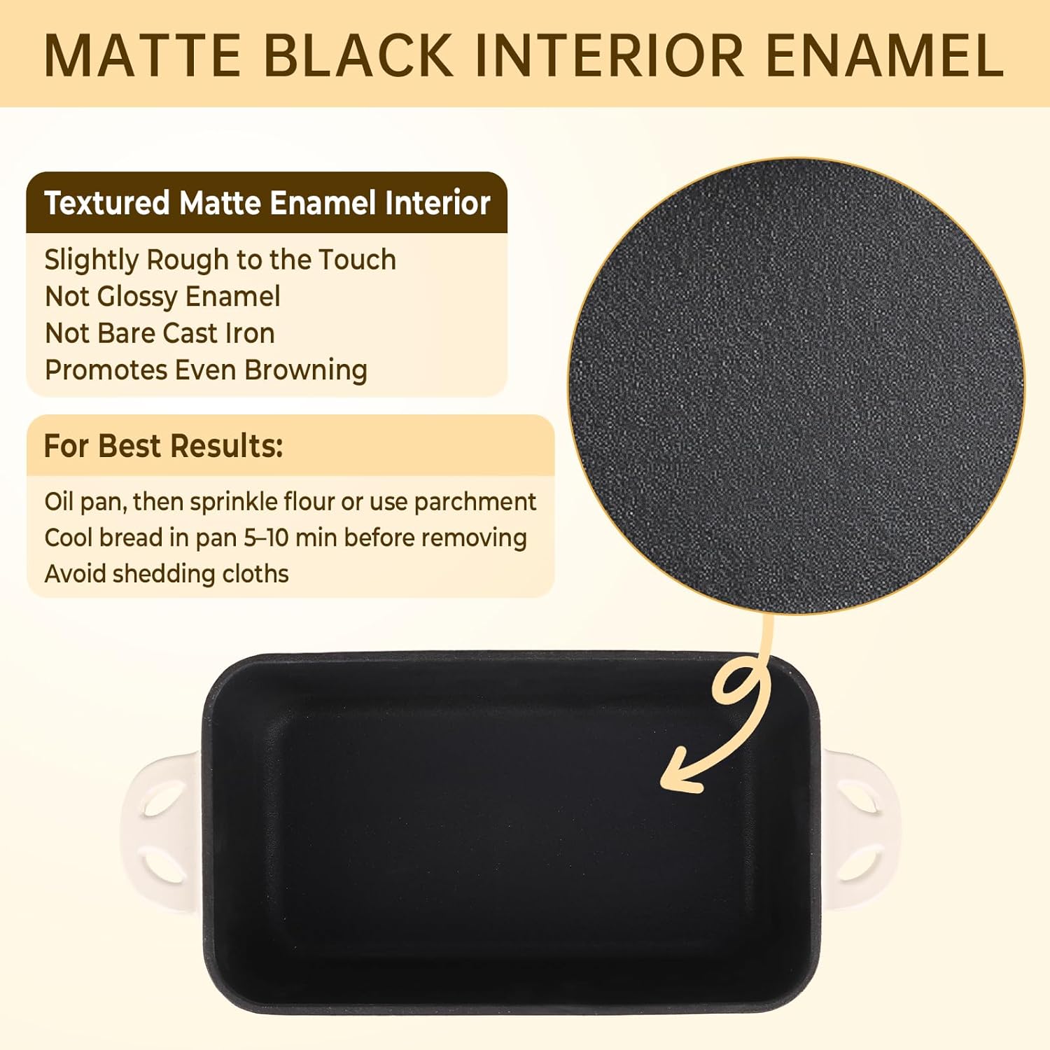 - Matte Black Interior Enamel: Slightly textured and non-glossy to enhance browning; resists scratches, stains and chips — great for baking homemade bread