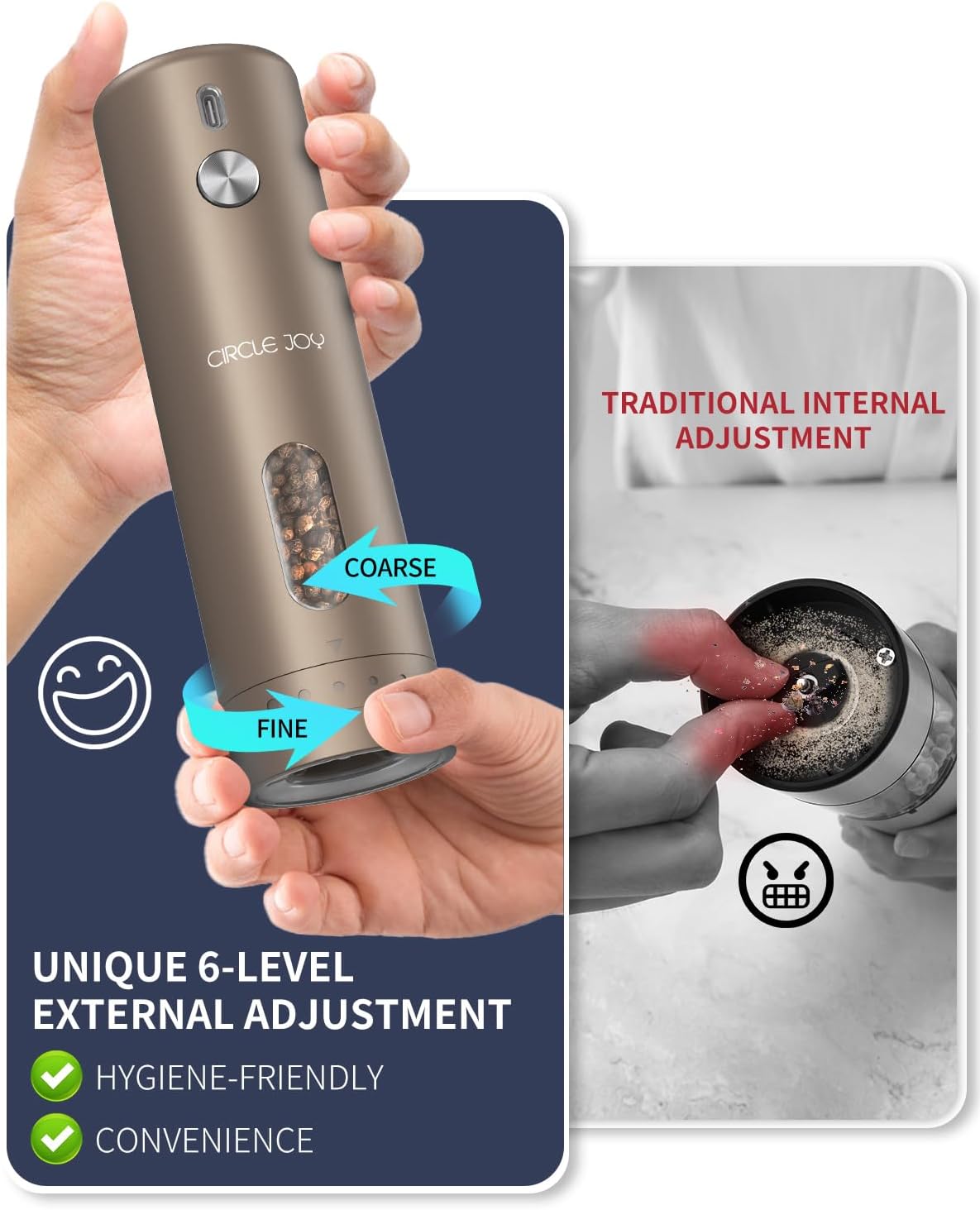 - 【HYGIENE MEETS CONVENIENCE】 - Say farewell to messy, internal adjustments and hello to a cleaner, more hygienic way to tailor your grind. CIRCLE JOY electric pepper grinder boasts an innovative external coarseness adjustment mechanism, allowing you to easily dial in your desired texture without ever having to touch the peppercorns. This keeps your hands clean while in use, making it a great choice for health-conscious cooks