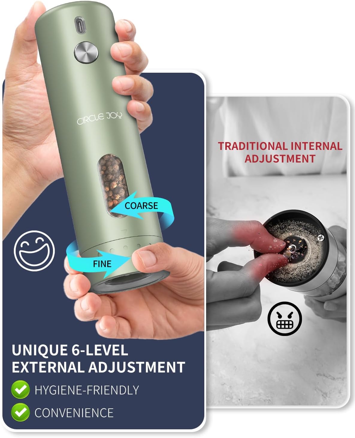 - 【HYGIENE MEETS CONVENIENCE】 - Say farewell to messy, internal adjustments and hello to a cleaner, more hygienic way to tailor your grind. CIRCLE JOY electric pepper grinder boasts an innovative external coarseness adjustment mechanism, allowing you to easily dial in your desired texture without ever having to touch the peppercorns. This keeps your hands clean while in use, making it a great choice for health-conscious cooks