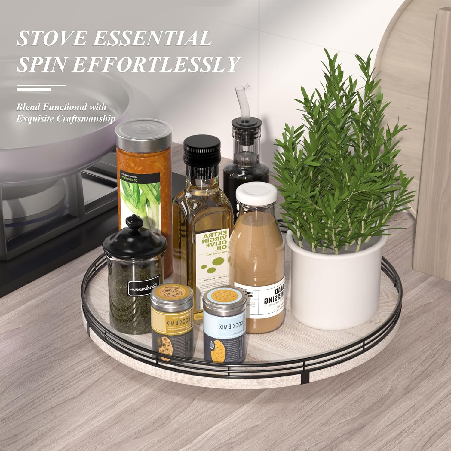 - 360 RATATING & MAXIMIZE SPACE: The base is made of solid wood and the spinning mechanism is made of steel ball bearings, which are well-built and allow for 360° smoothly spin. Making it super easy to access items at the back of your cabinet without having to remove everything in front. You can use it to store spices, condiments, and even small jars, and it keeps everything neatly in place.