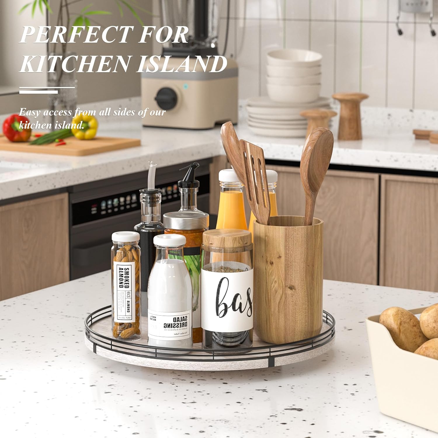 - PREMIUM MATERIAL: Our farmhouse lazy Susan organizer is made of natural wood and strong Iron, sturdy, durable and premium quality. This wooden turntable organizer is a game-changer for keeping your kitchen organized. The farmhouse finish gives it a rustic, charming look that will fit perfectly with your kitchen decor.