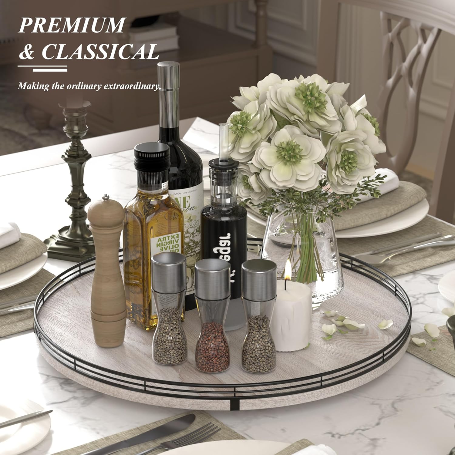 - PERFECT GIFTS: This wooden tray can not only be served as a lazy Susan to organize, but also be served as a decorative tray to decor your coffee table, dining table, kitchen, home with its charmed rustic farmhouse style. Perfect for a wedding, Birthday, housewarming gift, Mother's Day gift, or centerpiece for any occasions. Tastefully packaged, our turntable organization makes a thoughtful and practical gift for someone who loves home organization and home decoration. No assembly was required.