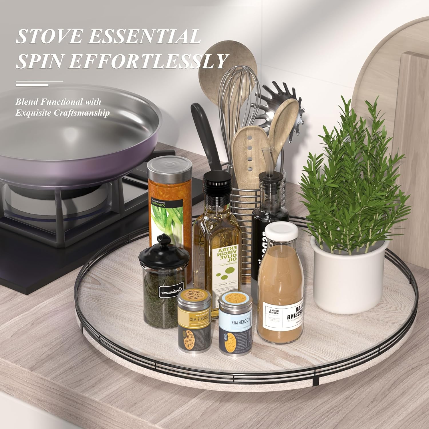- PREMIUM MATERIAL: Our farmhouse large lazy Susan organizer is made of natural wood and strong Iron, sturdy, durable and premium quality. This wooden turntable organizer is a game-changer for keeping your kitchen organized. The farmhouse finish gives it a rustic, charming look that will fit perfectly with your kitchen decor.