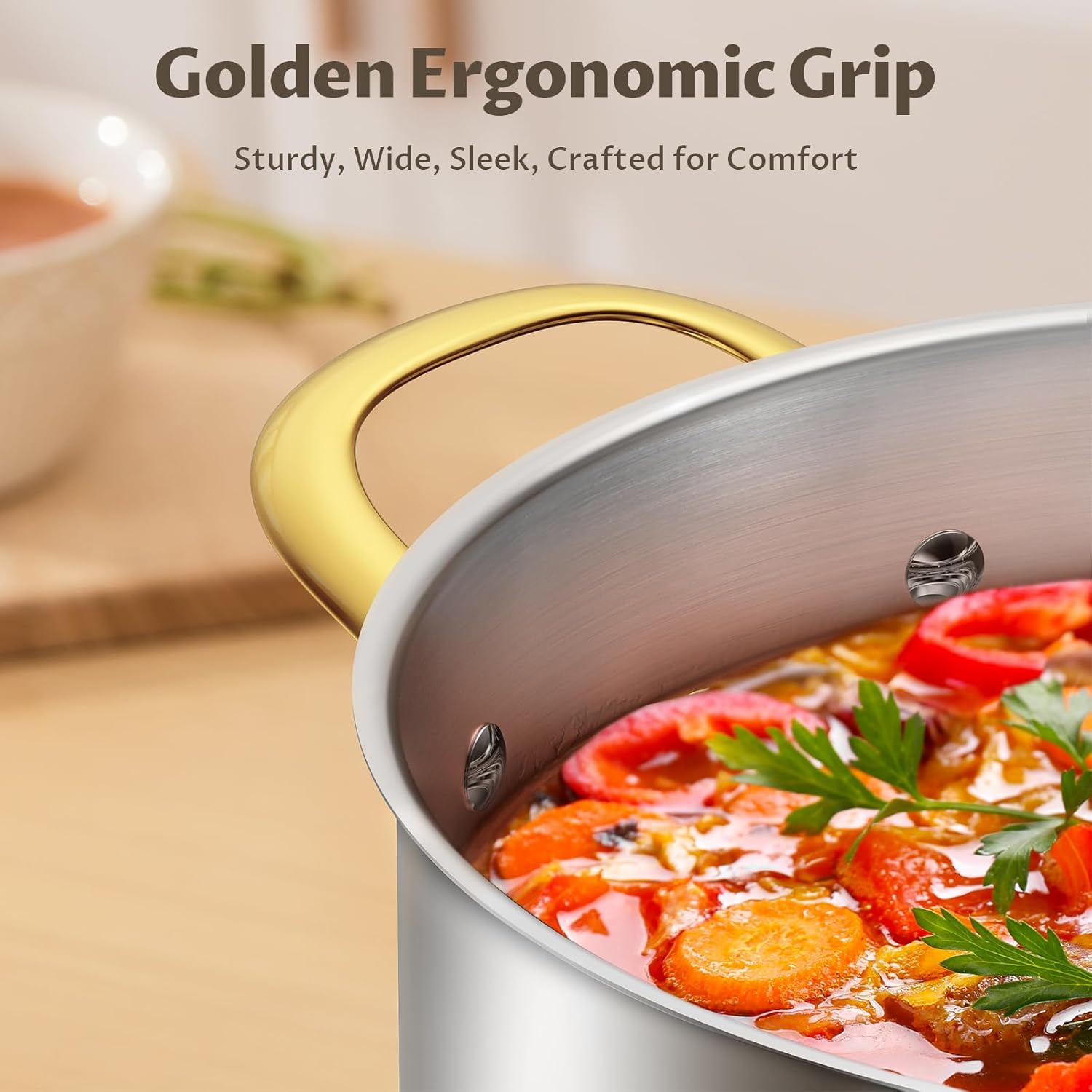 - ๐๐๐๐ฎ๐ซ๐ & ๐๐จ๐ฆ๐๐จ๐ซ๐ญ๐๐๐ฅ๐ ๐๐จ๐ฅ๐: Ergonomically designed golden stainless steel handles of this stock pot with lid , making it easy to handle and maneuver during cooking