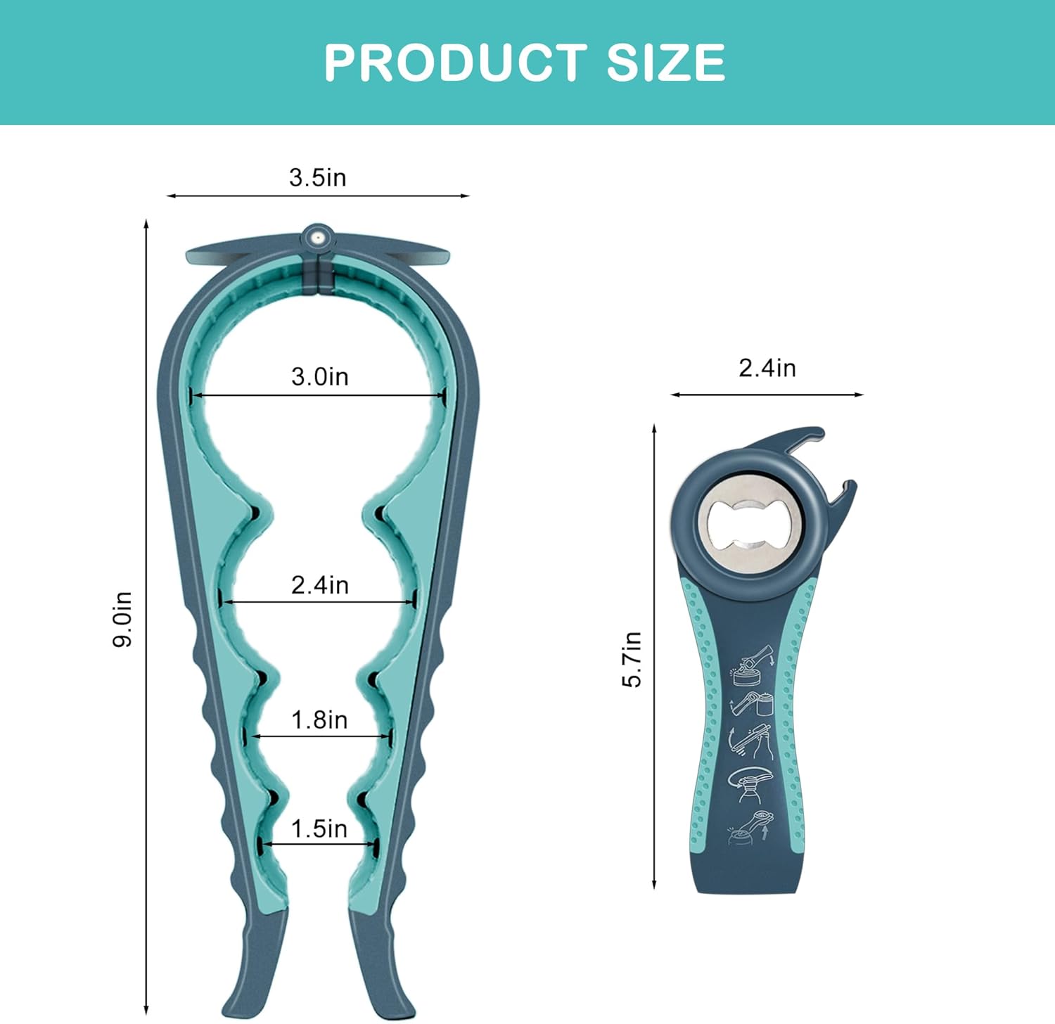 - Ergonomic design - The long handles will provide the strength and leverage you need to open effortlessly, the nonslip handles will ensure safety even when wet, the jar grip will provide superior grip when opening stubborn jars and containers of all sizes.