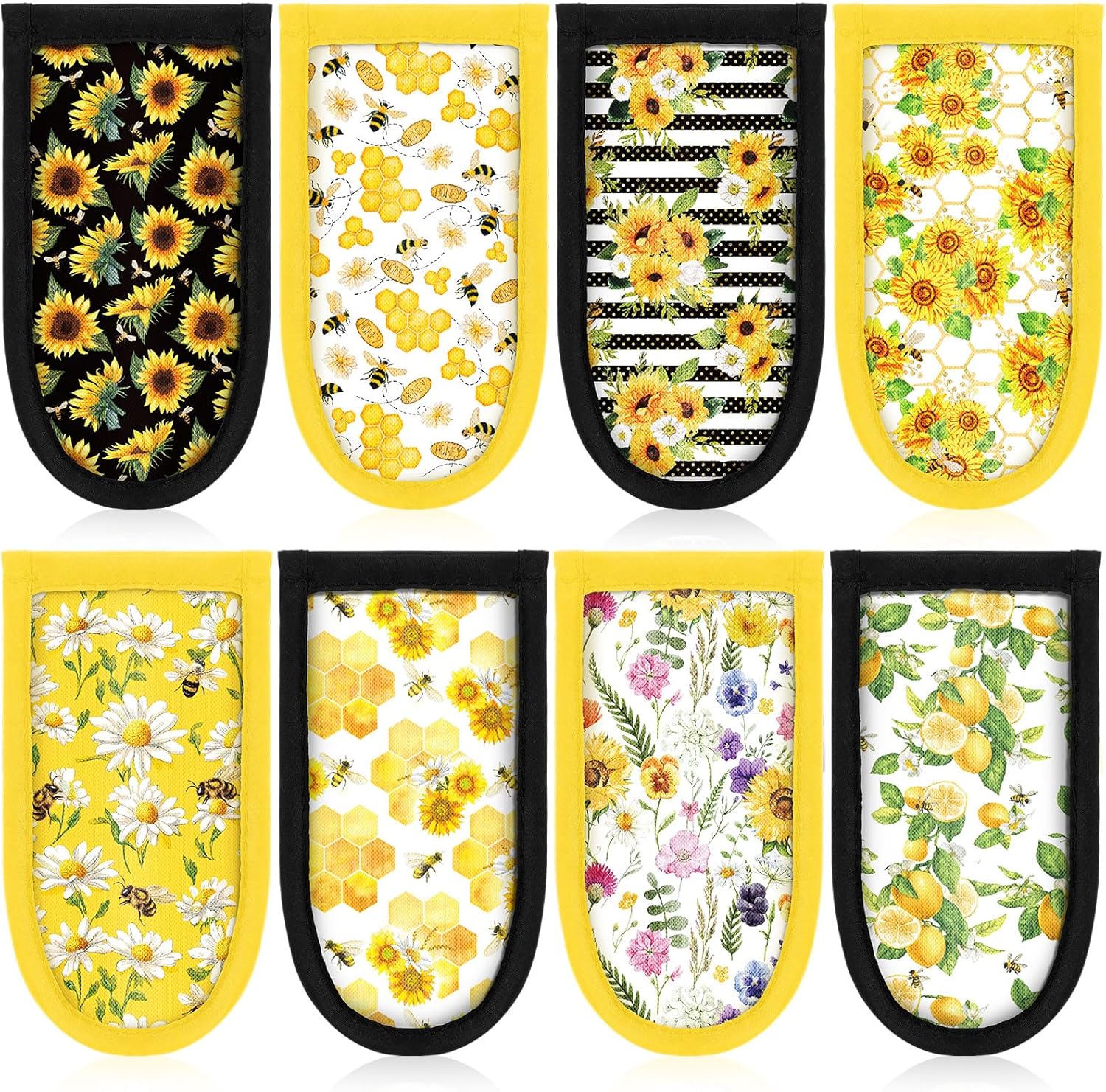 - 8 Different Styles Hot Handle Holders: 8 styles of these pot handle covers heat resistant for you to choose, including sunflowers in different shades, striped sunflowers, bee sunflowers, bees, daisies, spring flowers and summer lemons; You can choose the styles you want to add touch to the kitchen cookware