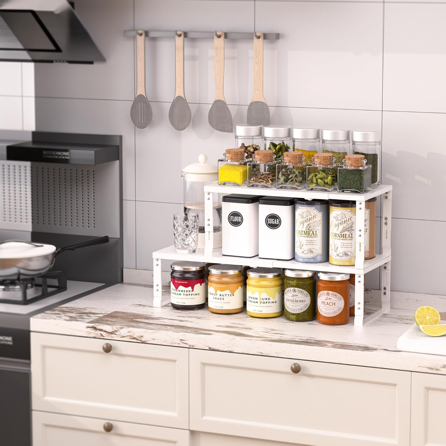 - 🥫 【Adjustable for All Shapes & Sizes】 "Four height settings accommodate tall spice bottles, deep dishes, or bulky jars. The modular design ensures secure storage for uneven items – no more tipping or cluttered counters!"