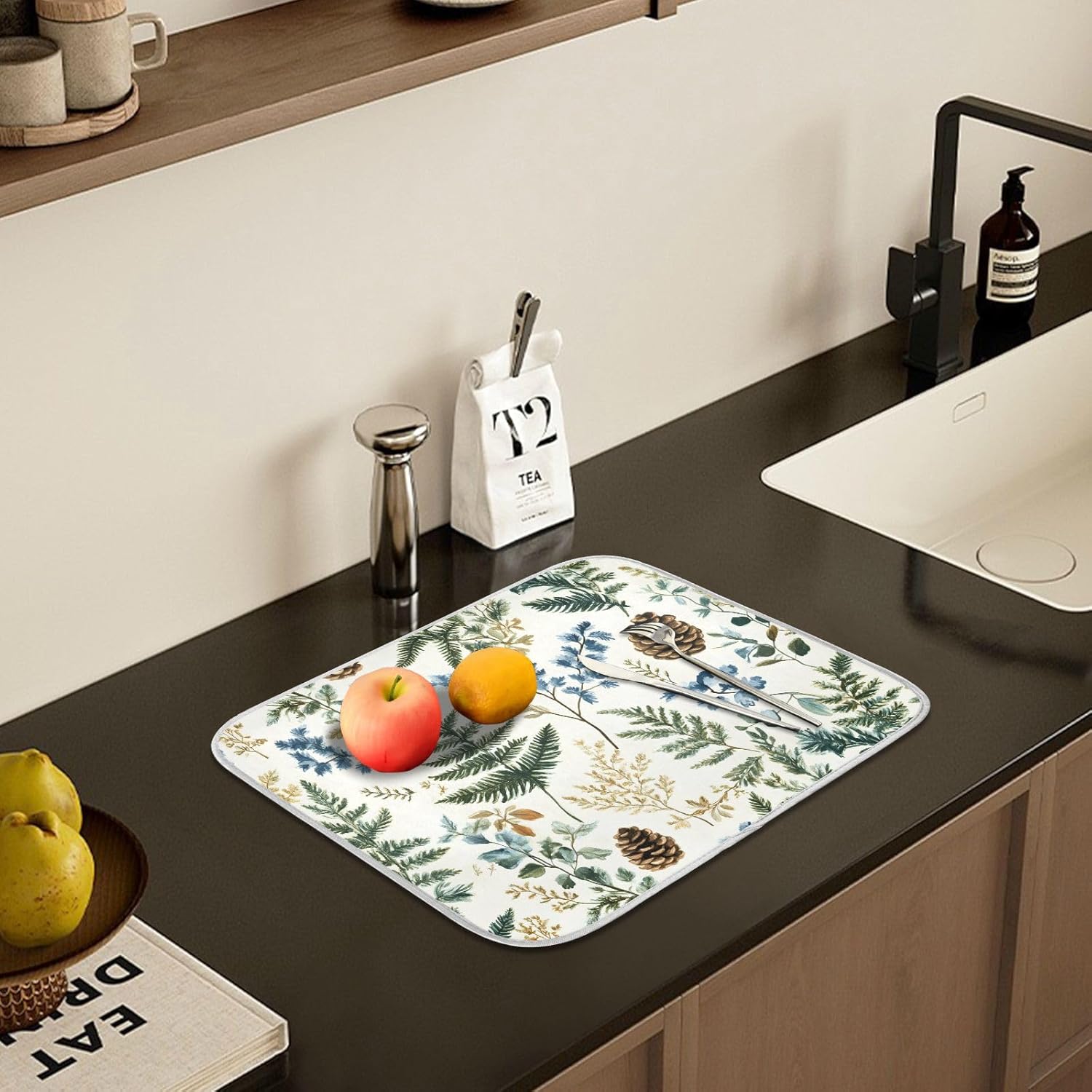 - Exquisite workmanship: This dish drying mat with durable and neatly sewing around the edge helps contain spills, the stitches don't fall off so that they are reversible for convenience and optimal performance, but one-sided printing, matchs delicate dishes and stemware, bring decorations to your home or kitchen, keeping tables clean, the soft and foldable material is easy to store, this dry pad has a lanyard design, which can be hung up when you are not in use and does not take up space