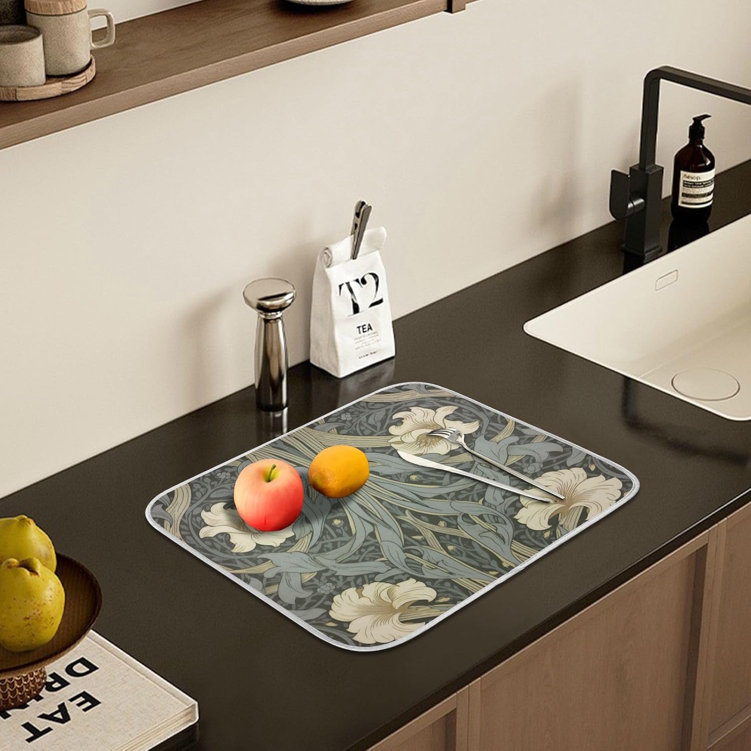 William Morris Flowers Print Dish Drying Mat for Kitchen Counter Absorbent Microfiber Small Drying Pad Dish mats for Kitchen Countertops 16 x 18 Inch