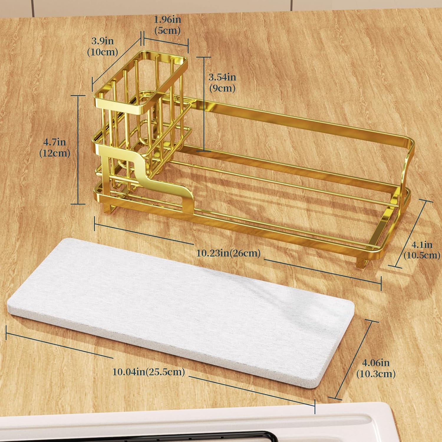 Consumest Sponge Holder for Kitchen Sink - Sink Caddy Organizer with Water Absorbing Stone Tray, Detachable Brush Holder, Stainless Steel Kitchen Counter Organizer Rack, Gold