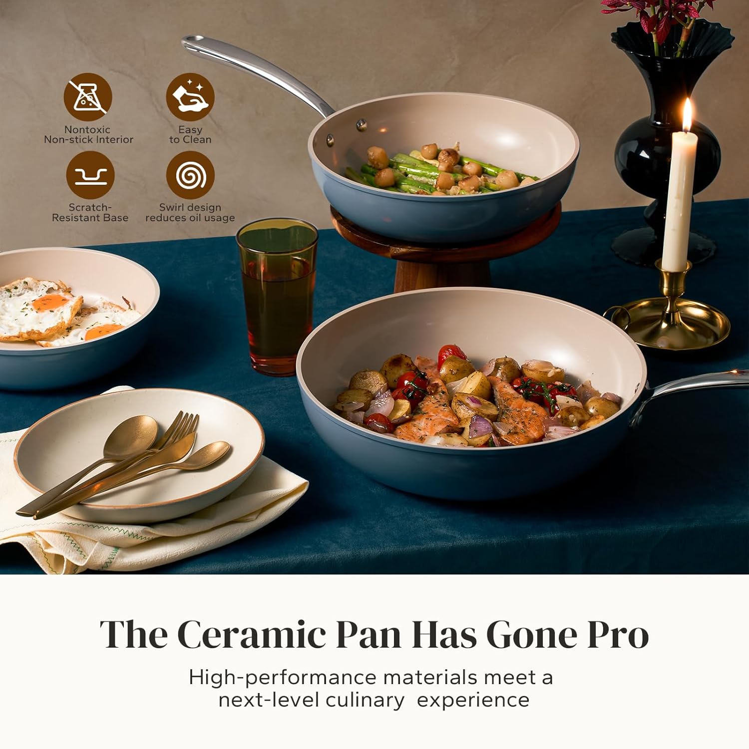 - EXCELLENT COMPATIBILITY: The induction cooking set features a large magnetized base that provides a larger heating area for fast and even heat distribution without hot spots. Suitable for all stovetops. Nonstick pan set and handle is oven safe up to 842 °F