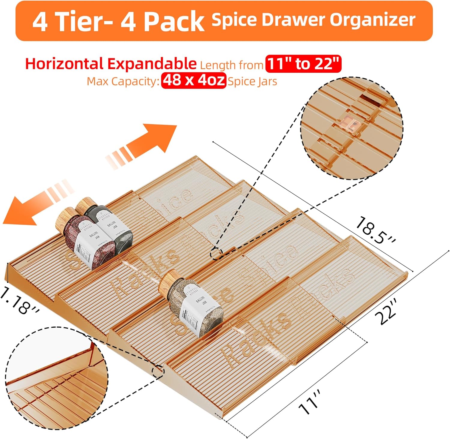 Spice Drawer Organizer, 4 Tier- 4 Pack Amber Acrylic Drawer Seasoning Organizer, Expandable From 11'' to 22'' Kitchen Spice Rack Organizers and Storage for Drawer (Jars not included)