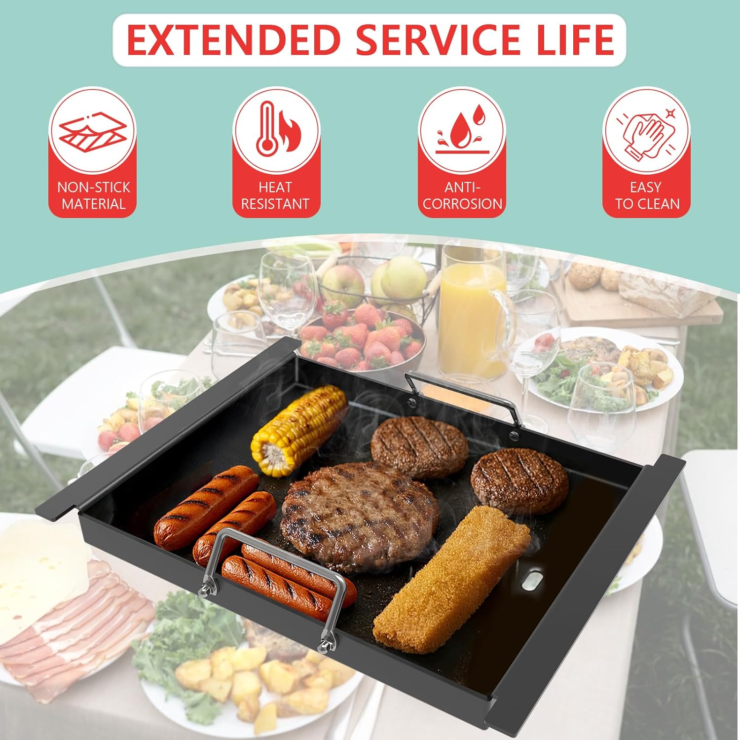 - Versatility: Experience versatile outdoor cooking and enjoy the benefits of a true flat griddle on your outdoor propane gas grill. Put in our Half size griddle insert, You can also put in 2 pack grill grates in it. Cook in separate areas without cross-mixing flavors and save your cooking time! Perfect for sizzling crispy bacon, grilling juicy burgers and savory hot dogs, or even steaming and stir-frying multiple dishes simultaneously—no more waiting around for your meals!