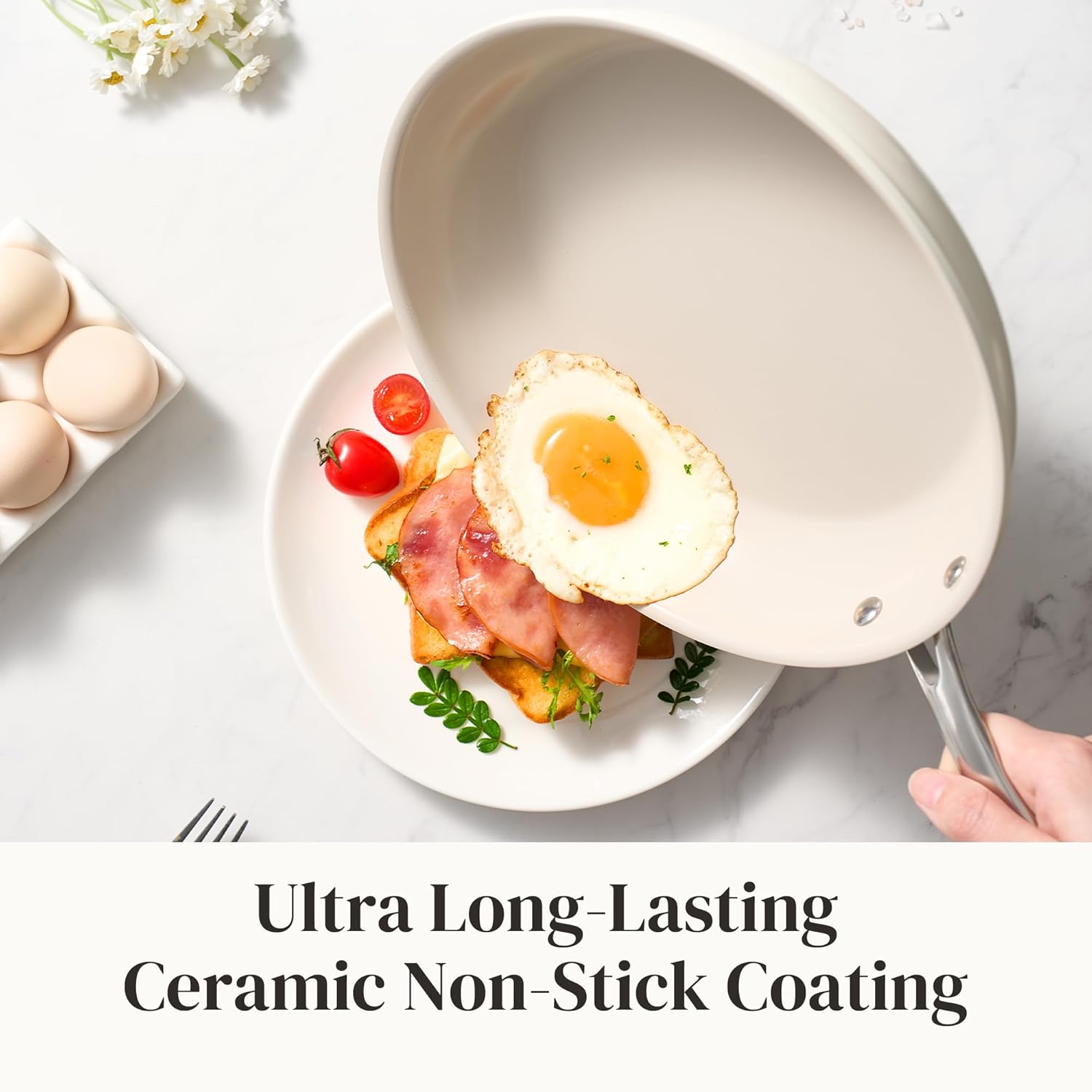 - COOL & STURDY HANDLE: Crafted from lightweight, precision-pressed stainless steel, this ergonomically designed handle ensures a comfortable grip. Double-riveted for exceptional strength and maneuverability, the ceramic skillet pan empowers you to seamlessly transition from stovetop to oven, allowing you to achieve that flawless sear, brown toppings, or even bake