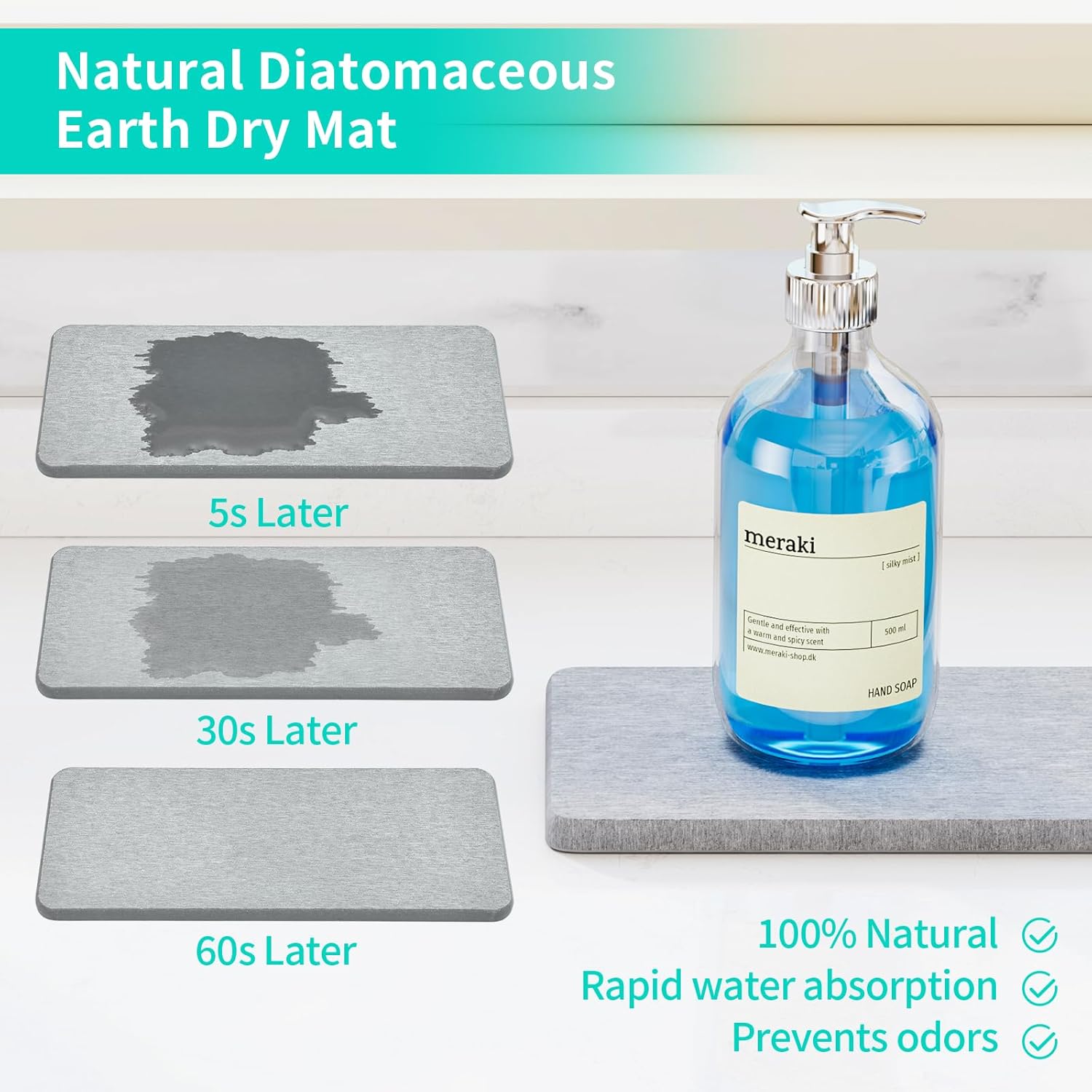 - [Instant Dry Sink Caddy]: The bottom of our sponge holder is made of diatomaceous earth absorbent mat, which automatically absorbs water and dries in 60 seconds, no longer need to manually pour water.The mat is removable, so you can remove it for cleaning