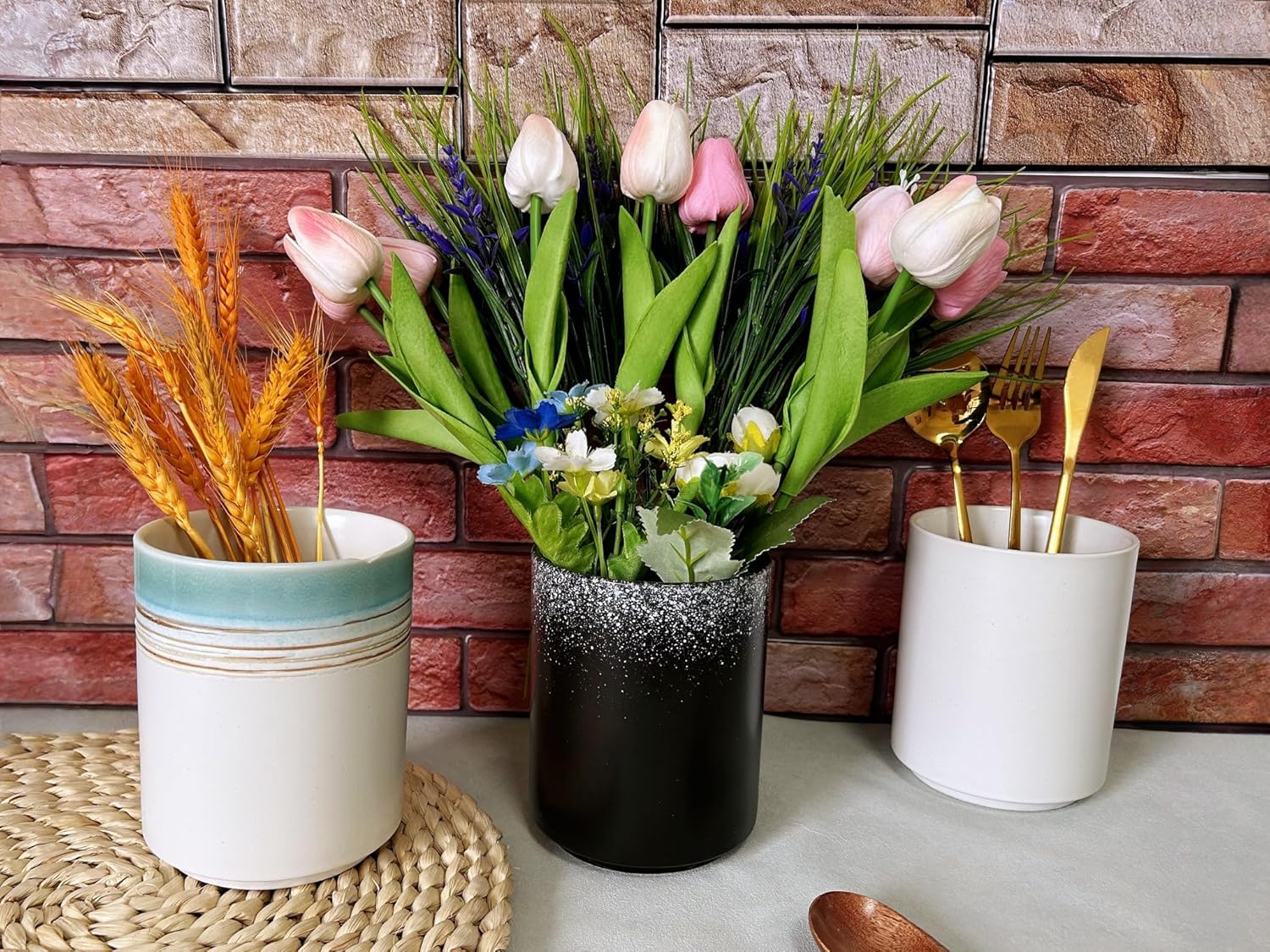 - 💕 【Multi-functional】: The spatula holder for counter may be used as ladle holder, cooking utensil holder, spoon holder, small utensil holder, tongs holder, whisks holder, knives and all kinds of kitchen cookware for keeping your kitchen neat and free of clutter, but also as vase, makeup brush holders, ice buckets, office supply organizers, cutlery holder, silverware caddy, flower vase, coffee pods and stirrers holder on your bar countertop.