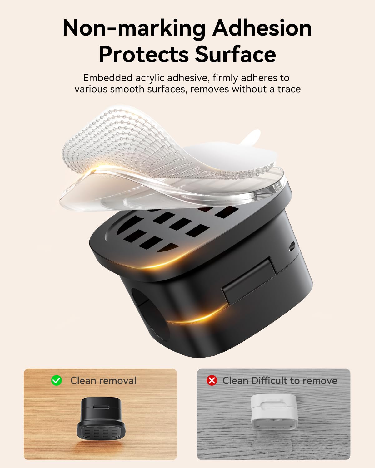 - Super Adhesive: The cable management Equipped with Upgrade Acrylic Adhesive, the adhesiveness is increased by 300% compared to ordinary 3M. It firmly adheres to smooth surfaces such as wooden tables/glass/ceramic tiles, and does not leave any residual glue after removal. Each box comes with a Reusable Adhesive Pad, which extends the service life and is more environmentally friendly and economical