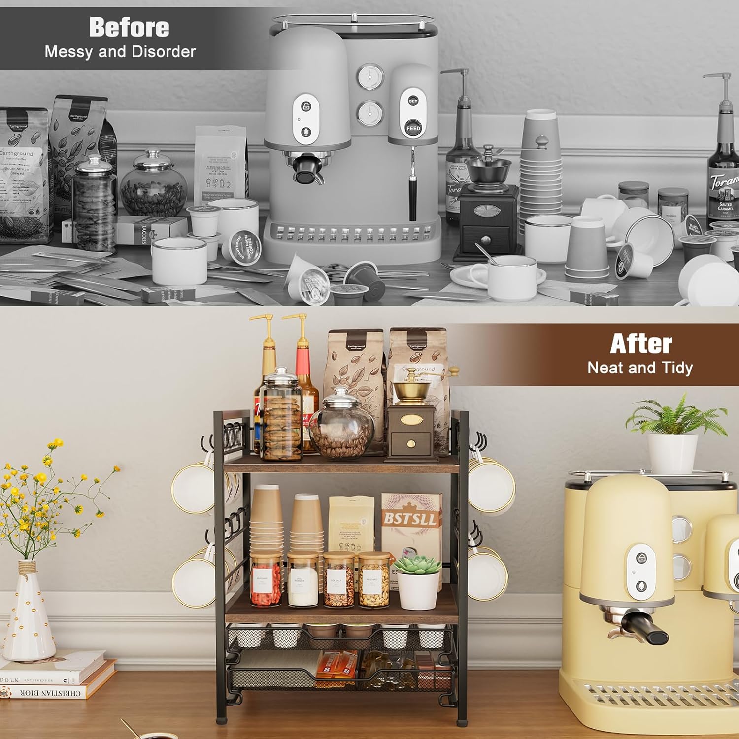 - 【Space-Saving Solution】This all-in-one coffee organizer for countertop combines combines mug holders, coffee bar organizers, and coffee pod drawer to help you maximize space, keeping everything neatly accessible. Suitable for smaller kitchens or coffee nooks, it is an great choice for limited spaces to storage coffee