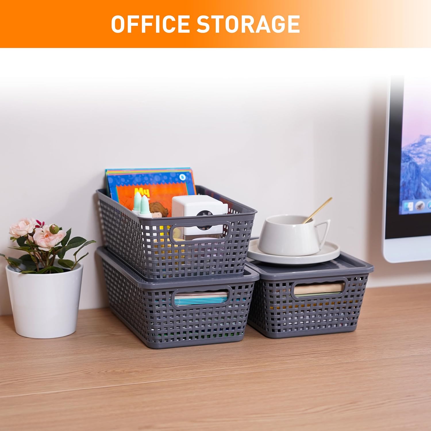 Plastic Storage Baskets With Lid, Storage Bins for Organizing, Stackable Decorative Containers for Shelves Drawers Desktop Closet Playroom Classroom Office, 6 Pack-Grey