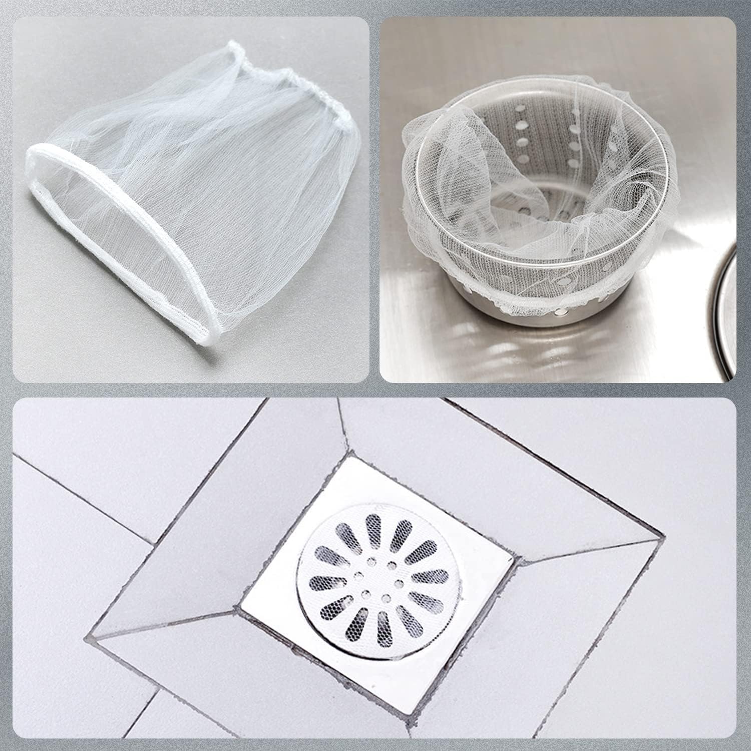 - 【One Size fits All】The mesh sink bag is made of high-quality polyester with excellent stretch. The size is 3.9"x3.9". It fits all sizes of sink drain filters for kitchen sinks, bathroom sinks, floor drains, laundry tubs, utility sinks and shower drains.