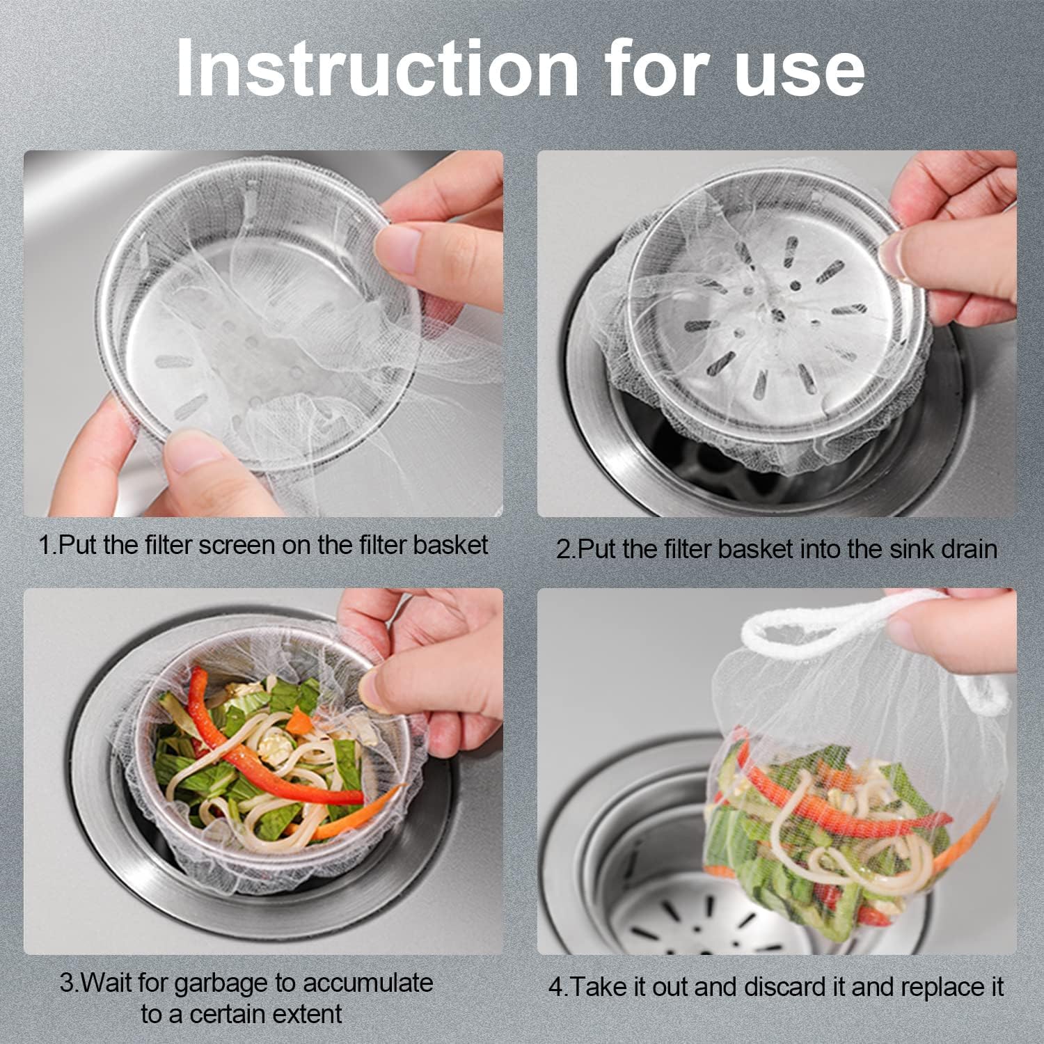 - 【Easy to Use】The sink strainer filter bag is easy to use and replace, just put the mesh bag on the kitchen sink strainer, no additional tools required. No need to wash it, just lift it up and throw it in the trash and replace it with a clean one after finishing washing your dishes.