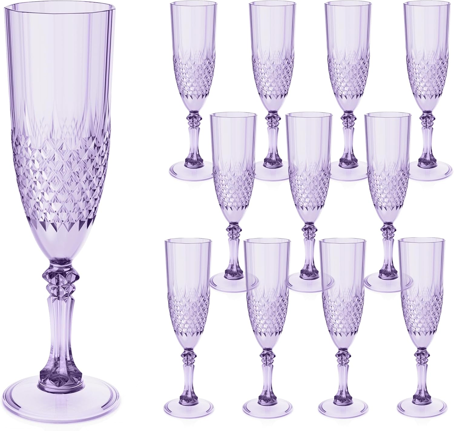 - Charming Set: Champagne flutes set include 12 retro-style light purple champagne plastic wine glasses, providing ample quantity to meet your daily use and replacement needs. A suitable champagne cup is the icing on the cake. Plastic wine glasses not only carry the wine, but also carries the laughter and blessings