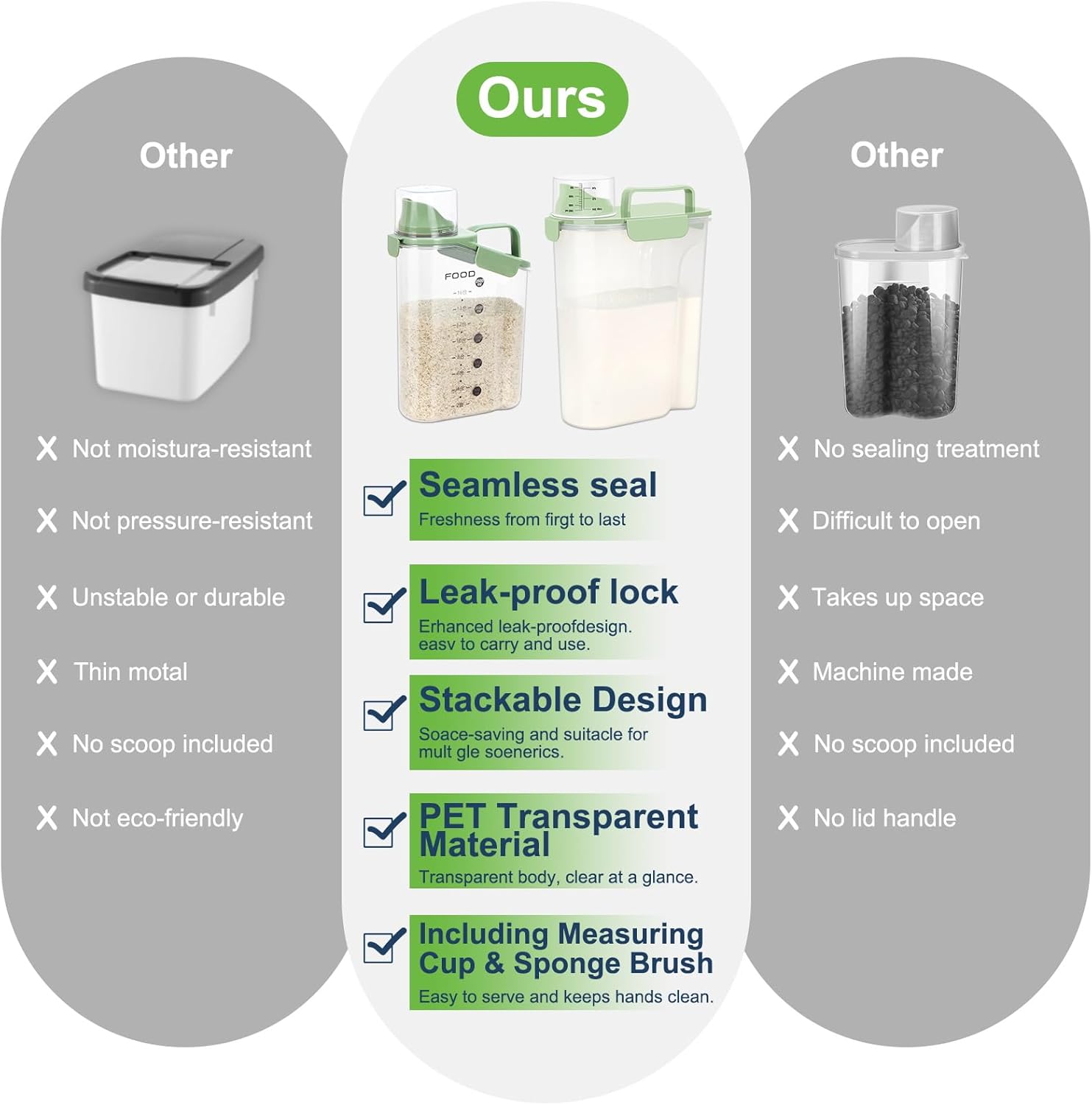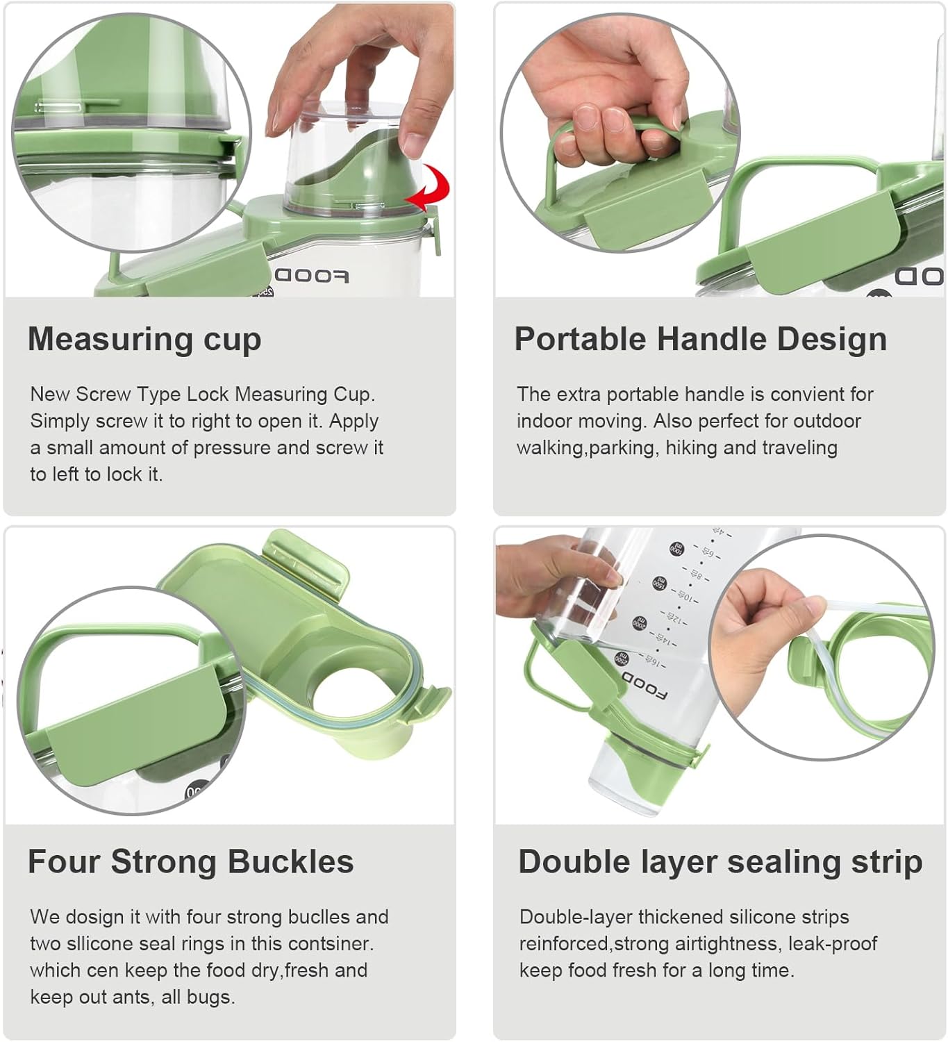 - CLEAR RICE HOLDER:The clear pet food container allows you to identify the contents at a glance,clear visibility and better organization.the cereal dispenser will keep your kitchen pantry neat and organized.there is also a portable handle for easy movement and going out